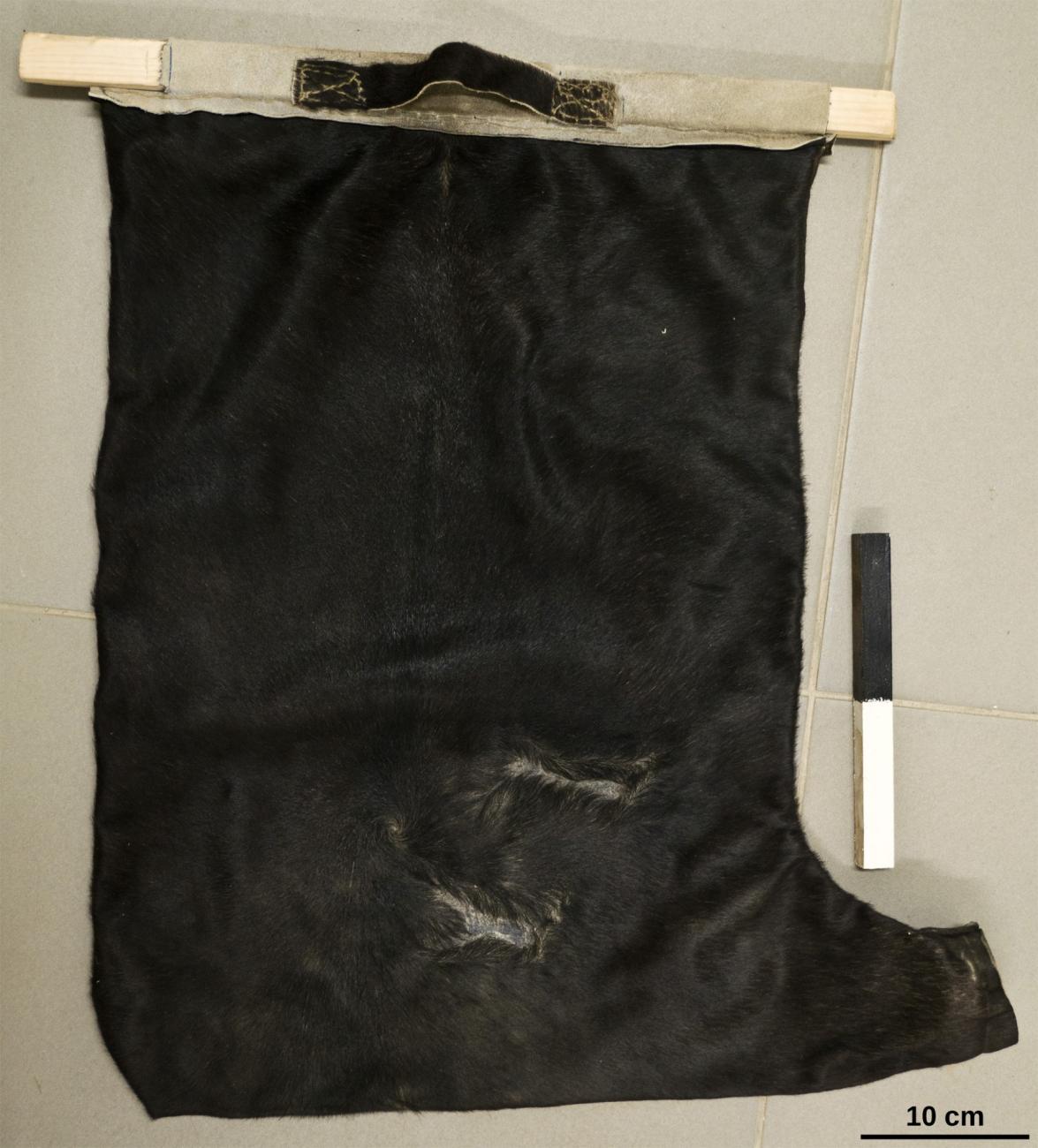 Bag bellows were sewn from cow leather with a sewing awl and waxed polyester thread. Wooden rails were used to stabilise the inlet (see Figures 3a–b). Taking non-perfect tightness of the openings and the variation of different operators into account, about 10 l of air were delivered per stroke. Wooden pliers made from the same material were prepared to handle the crucibles. Copper filings, antimony shot, and lead granulate were mixed in set amounts (See Table 1) to simulate a range of polymetallic alloys used for lost wax casting in the Chalcolithic Southern Levant (arsenic was excluded for health reasons). Unfortunately, little is known about the fuel used for metallurgical operations in the region (for a case study from Faynan, see Engel and Frey, 1996). Due to its availability in a sparsely vegetated landscape, commercial citrus charcoal was employed, although it was not available in the Chalcolithic (Langgut, 2017). Temperatures were recorded with an infrared pyrometer BTMETER BT-1500 (accuracy for temperatures > 0°C: ± 2 % of measured temperature + 2°C, i.e. ± 22°C at 1000°C) and should be regarded as estimates as it was not always possible to see the focal points on the burning charcoal.