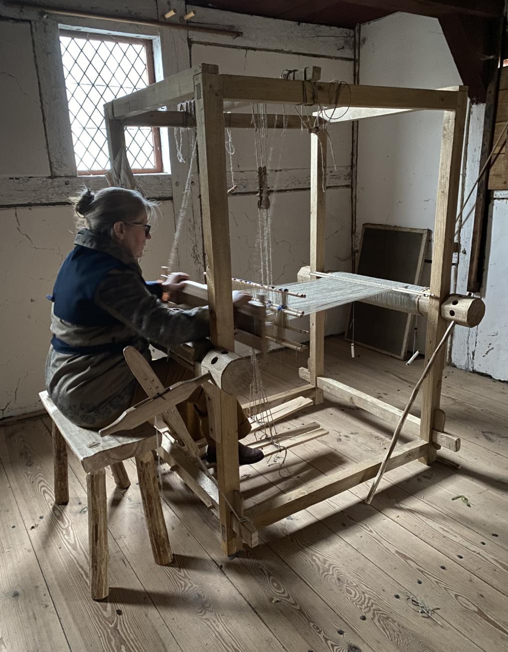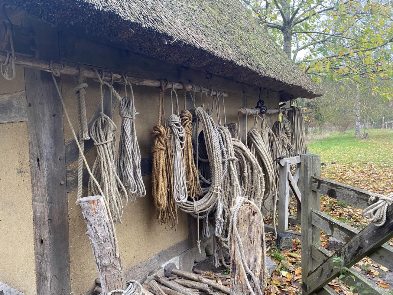 The second part of the day focused on practical demonstrations and project displays. Thit Birk Petersen started with a tour of the grounds of the Medieval Centre including their medieval town Sundkøbing built around the year 1395, followed by a practical demonstration of the trebuchet. Thereafter Søren Lise gave a presentation on the practice of rope making. Different rope-making equipment and types of rope were presented as well as how to make these. Due to rain the actual rope making could not take place, but everybody was invited to make rope with him at another time. The next presentation was held by Dorte Kampp, who presented the new loom at the Medieval Centre. It was built using medieval tools and set up as it is believed to have been originally. Textiles made on the loom were presented as well as a practical demonstration of the loom working.