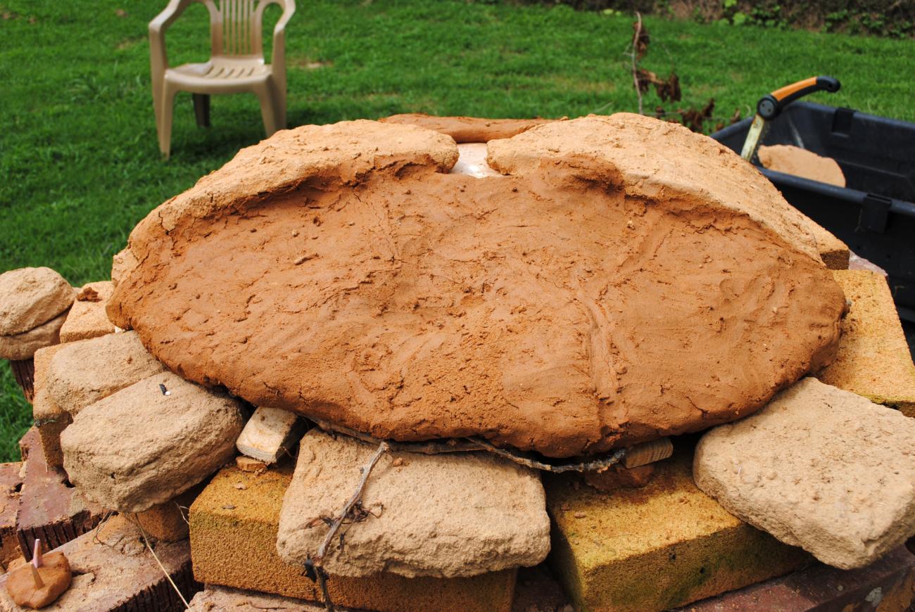 After the pilot test firing that was described above, a new dome was created. This dome was made out of stoneware that was purchased at a local pottery shop and was the same quality as the small version of the scored basin. The idea was that by creating this temporary dome out of clay that was already processed and wedged, then it may work. The construction of this took approximately four and a half hours using the coil and slab technique. This temporary dome was left to slowly dry over the duration of several days until the first firing took place. However, the dome did not survive the drying process due to the uneven hardening of the clay which resulted in cracking.