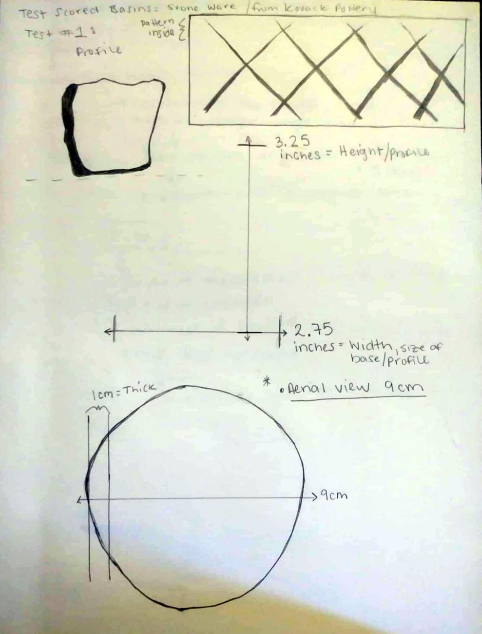 Regarding the pilot test versions of the ceramic vessel, the stoneware clay seemed to have consumed the least time in this portion of the experiment. Stoneware was purchased through a local pottery shop. The clay itself was a light grey that turned completely white after the drying phase. The scoring inside as stated above was only designed as an example for the large-scale version. âXâ-scoring the inside of the vessel was done using the slightly sharp end of a pottery tool.