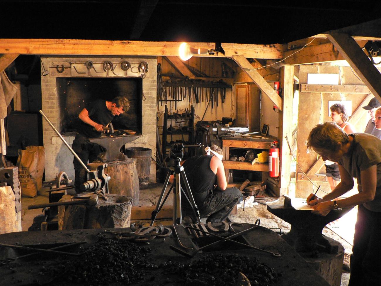 Very few experiments have been conducted on drawing wires of iron made from bog ore. One of them, however, was carried out at the forge at Lejre Land of Legends in Denmark. The iron used for the experiments was obtained from three different sites in Denmark where well-documented experiments in the extraction of bog iron ore took place. Hardwood charcoal, a one kg blacksmith’s hammer, two pliers (one with serrated jaws) and two modern hardened steel drawplates were used. The experiments demonstrated how the blacksmiths quickly developed a routine for extracting the soft, slag-containing iron. The experiments demonstrated that it was neither difficult to wind the wire nor to cut and assemble rings, such as those used in, for example, chain mail. Viewed in an archaeological context, the most important result was the characteristic waste left behind by the process which should be identifiable in the source material.