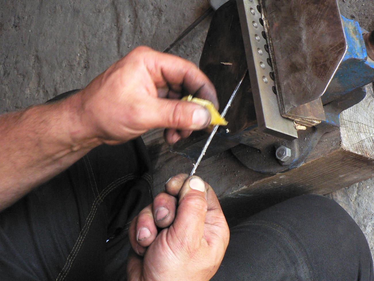 With these experiences, another Store Dyrehave billet (57 g) originating from the same bloom was forged into two thin rods (12.4 and 16.1 cm in length) in five and six heats, respectively (See Figure 6.). As the smiths expected difficulty from the slag-laden iron and anticipated that hardening would occur during the draws, they decided to reduce the friction by rubbing the wire with beeswax after each annealing and filing (See Figure 7). The rods could then be drawn through three holes. The short piece broke, but both fragments were subsequently drawn through the 2.5 mm hole. The longer of the two rods was drawn to almost double its length (25.7 cm). Next, the smiths used two billets from a bloom with 0.05 carbon and 0.2% phosphorus. These had a lower slag content than that found in the Store Dyrehave iron. The billets came from bog iron ore sourced in Guldforhoved. The first billet (65 g) was forged into two thin rods of 9.1 and 10.4 cm in five heats, which were drawn through three (up to 2.5 mm) and six (up to 2.2 mm) holes in the drawplate, respectively.