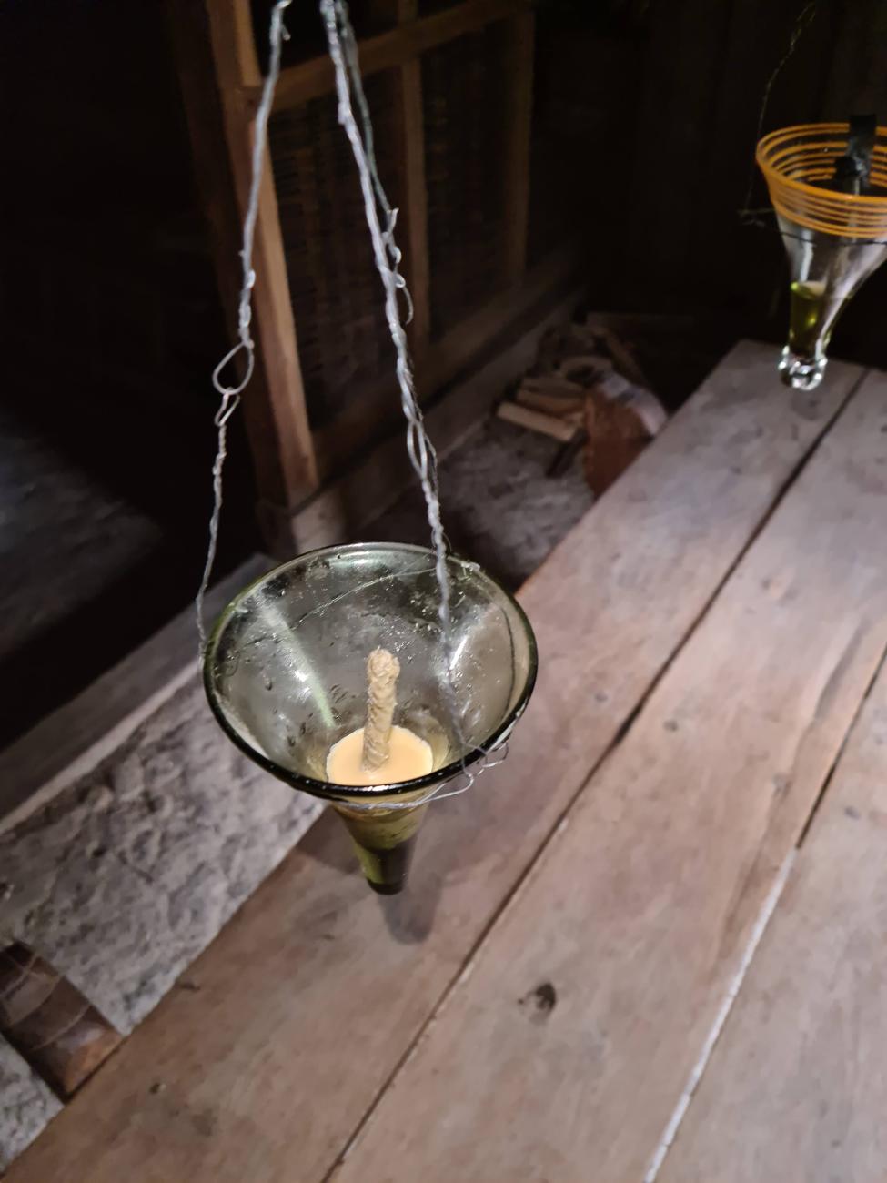 In Medieval illuminations you occasionally see funnel-shaped lamps hanging down from the ceiling. These lamps are depicted with a clear flame in the middle. From the UK there are household accounts from the Middle Ages which show that oils were purchased for use in lamps (Fouquet & Pearson, 2006). In the Domesday book, Ælfric, abbot of Eynshamn writes in the year 1000 that merchants import oil, https://www.domesdaybook.co.uk/. These lamps could be made of clay, but when purchasing more expensive oils such as olive oil it can be assumed that these richer households could even afford glass lamps. The idea is not entirely without evidence, as whole chandeliers with hanging glass goblets, even up to six goblets, have been found in Byzantium. I set out to try to use glass cups as lamps and in doing so investigate problems and answer some of the questions that I had about the process. These are the questions that the project aimed to address: