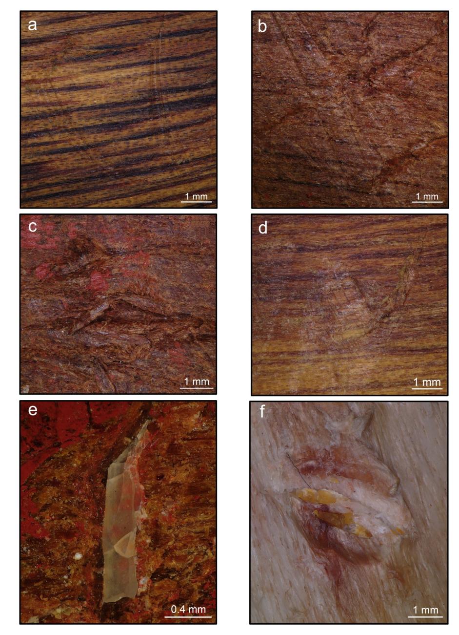 The experiment also revealed distinctive markings on use areas of boomerangs that are rarely seen on bone retouchers. Some of these marks (See Figure 10c) appear as small detachments of a thin layer of wood surface in correspondence with linear impact traces (Boomerang 3 use area 3); their characteristics are similar to âpeelingâ marks observed on broken bones (Fernandez-Jalvo and Andrews, 2016), or weathered bones used in knapping activities (Mallye et al., 2012; Doyon et al., 2018). Additionally, certain small, shallow, and parallel markings were discovered that extend perpendicularly from the borders of the linear imprints (See Figure 10d) and defined as 'tool-edge scratches' (Bello et al., 2021).