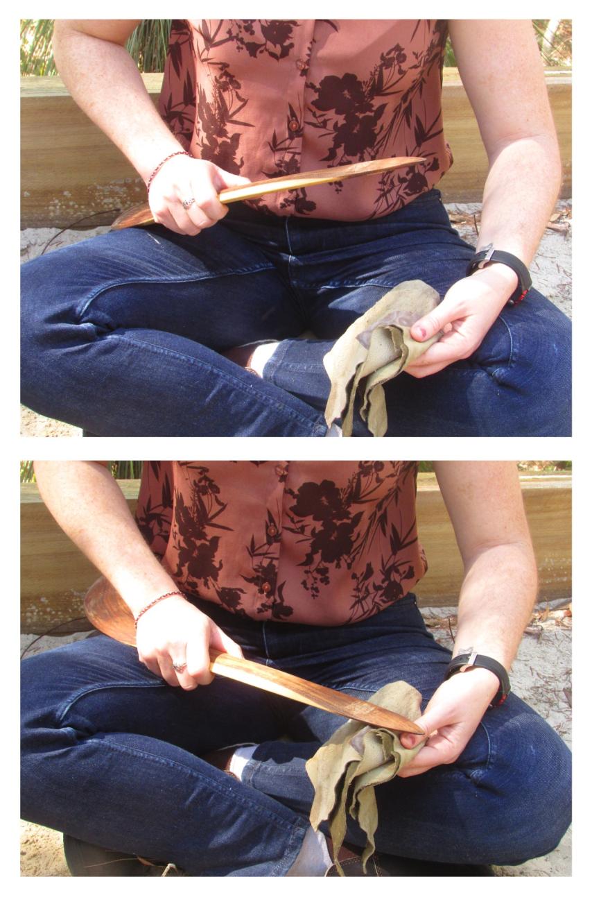 The percussive action used and observed throughout the experiment closely reflects the words used in anthropological literature to describe the movement involved in retouching with boomerangs ("to tap," "to strike"). References in the literature to the use of the flat surface of the boomerang in retouching (Roth, 1904, p.17; Tindale, 1965, p.136; Davis, 1979, p.55) were corroborated by the experiment.