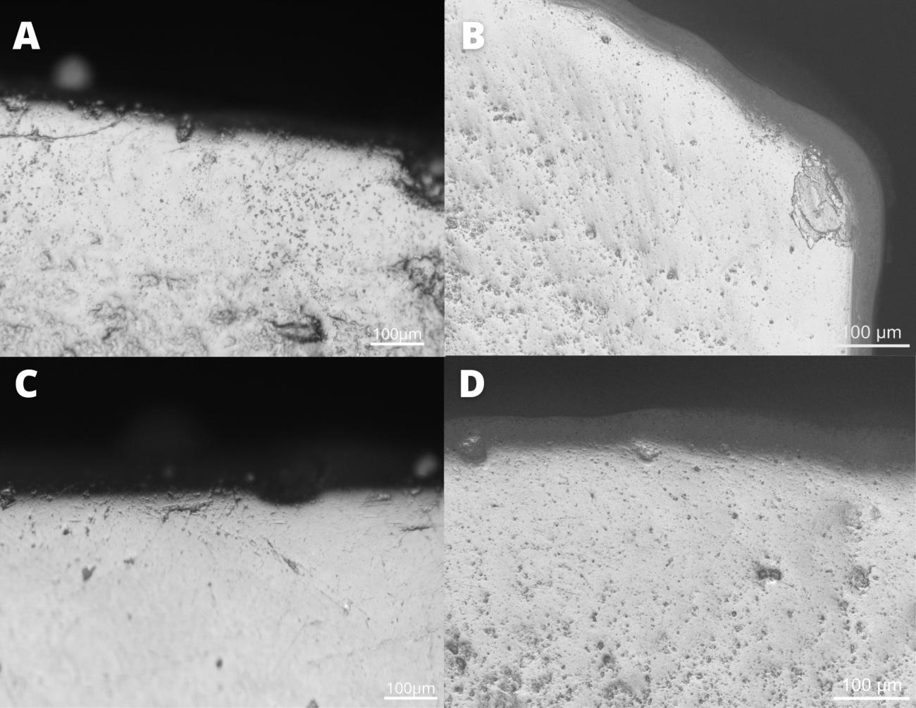 Two scrapers were used on a seal skin with sand as an additive, the other two experiments were used to scrape the skins with clay (See Table 3). All four scrapers displayed a wide zone with macroscopically visible gloss along the edge. This macroscopic gloss was previously also identified on an experiment by Van Gijn in which a fresh deerskin was scraped with ochre (Van Gijn, 1994, pp. 181-183).