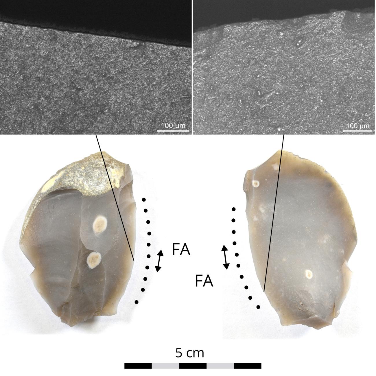 Occasionally, some diagonal directionality was noted which hinted at a cutting motion. In general, the polish looked like the polish that is attributed to cutting soft animal materials. This hide-working stage does not create characteristic use-wear traces. Archaeologically, the traces would either be classified as meat cutting polish, fresh hide cutting polish, or the traces would simply be missed because this very weakly developed polish can easily be overlooked or be confused with post depositional surface modifications.