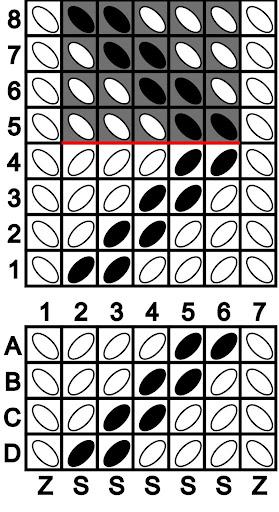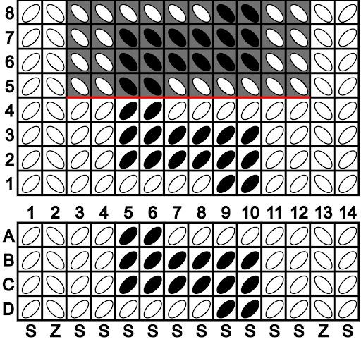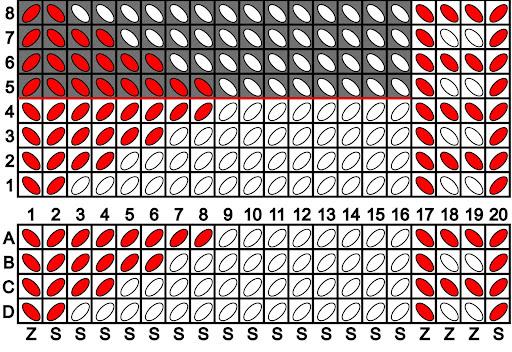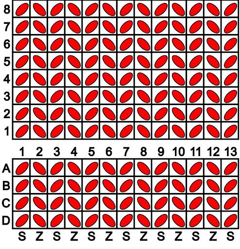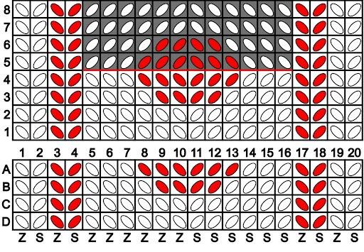 As the majority of the patterns are based on visual depictions, the number of tablets used is informed by the surviving tablet-woven bands. Tablet-weaving can use dozens of tablets to make complicated designs many centimeters wide, but the designs depicted on the Tomb of the Triclinium are more simple geometric shapes. While this fact does not inherently determine the size of the bands, extant Italic finds tend to be between 7 and 18 tablets, although this could suffer from survivor bias (Knudsen, 2019, pp.256-257; Cutler, Demova and Gleba, 2020, pp.21-23). The S and Z written on these patterns is not indicative of the way the thread was spun, but the way the thread is threaded through the tablets. On the tablet-weaving patterns shown below, the S represents warping the threads through the face that faces to the right, with the Z representing warping the threads through the face to the left (Howard, 2008, Designing the Band). In this experiment and in general, the author orients the cards with the faces that are wood burned facing the right, and the blank faces facing the left.