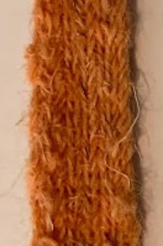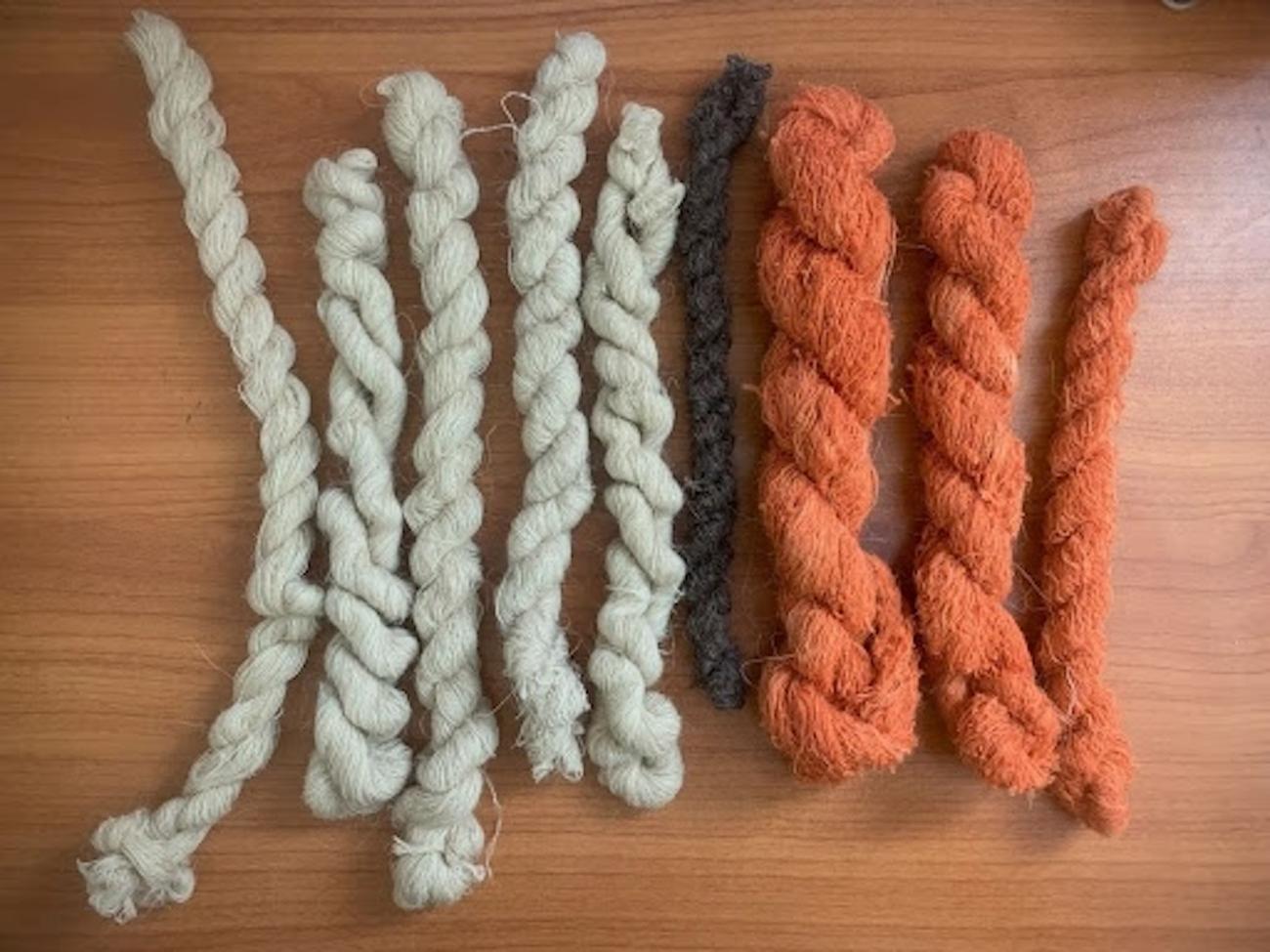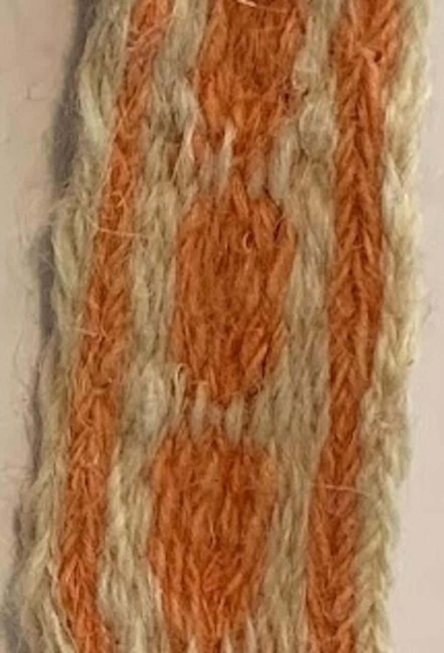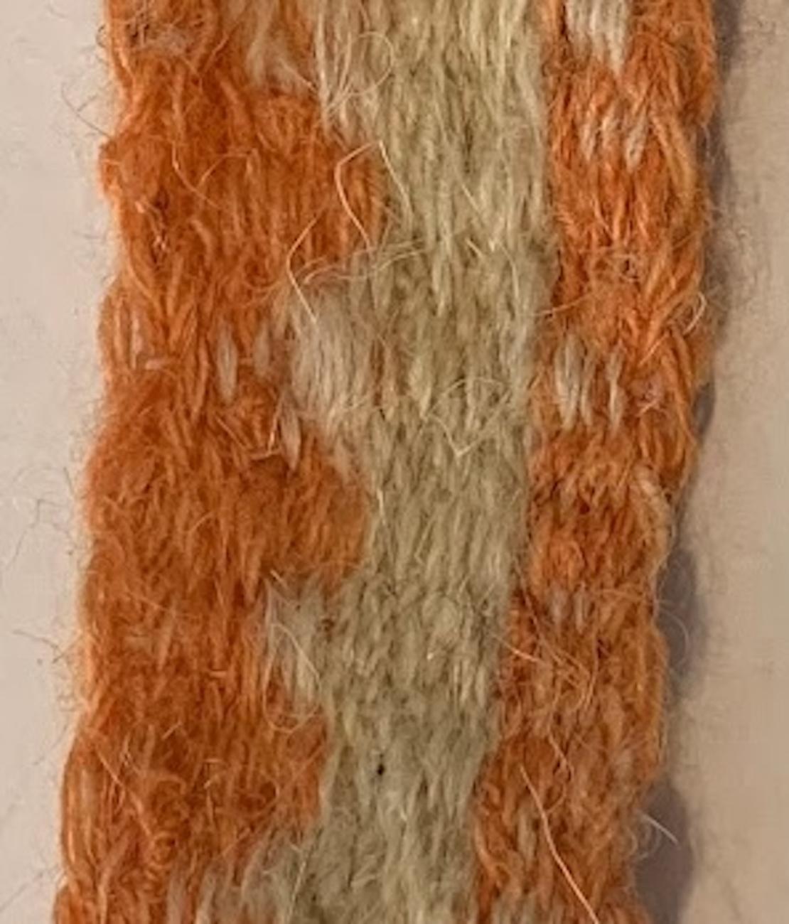 In ancient Etruria many other colours were often used, including blue which is documented in Verucchio (Stauffer, 2019, pp.249-250). From the Verucchio site and the depictions of Etruscan wall art found in Tarquinia, the tablet-weaves themselves often are a contrasting colour to the main textile; i.e. a red cloak with a blue tablet-woven hem (Steingräber, 2006, pp.138-139; Stauffer, 2019, pp.249-250). Madder dye, white, and dark brown were chosen specifically to mimic the colours from the Tomb of the Triclinium in Tarquinia and the site at Verucchio (Steingräber, 2006, pp.20-21,133-139; Stauffer, 2019, p.250). 76 grams of yarn was dyed with madder root dye and potassium alum sulfate after it was spun. The addition of the mordant, potassium alum sulfate, while not confirmed in the ancient world, creates a much more stable dye than the madder would have had on its own. In this case the author supplemented the historical accuracy with modern products for the sake of the longevity of the final product. Madder has been well documented as a dye in the Mediterranean (Martelli, 2014, pp.122-123; Canavan, 2015 , p.115; Spantidaki, 2016, p.63,79,87; Gleba, 2019, pp.224-225). The particular madder dye for this experiment turned the yarn an orange or a scarlet colour. Natural dying is not entirely predictable. The extant finds were more of a true red than was achieved in this experiment. This could be due to the amount or type of the mordant, the madder itself, temperatures, pH, or a variety of other factors (Carroll). The main purpose of dyeing the thread was to show a colour difference in the patterns using a dye that the Etruscans themselves used. The wall paint used in the Tomb of the Triclinium would also be made out of a different pigment and therefore would not match dye colours perfectly (Steingräber, 2006, pp.20-21). The colour, while not matching the paint in Triclinium, does show this contrast well. Some of the yarn used in all three of the colours is depicted together in Figure 9.