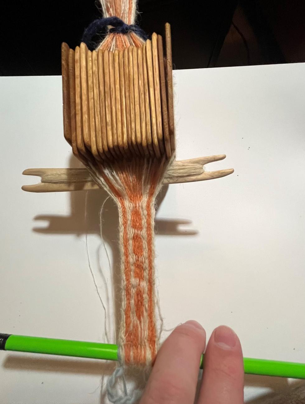 Tablets can be woven vertically on a warp weighted loom, with weighted spools holding the warp threads (Knudsen, 2019, pp.259-260). It can also be done horizontally as a form of backstrap weaving. Linda Foxhall theorizes that the backstrap method was more common, as no image of a tablet loom exists from antiquity (Brown University, 2016). The backstrap method was used in this experiment, both for its historical significance in the Mediterranean and because this is the method that the author is proficient in (Siennicka, Rahmstorf and Ulanowska, 2018, pp.3-4). Backstrap weaving requires a rod to tie the warp threads onto, and a strap to tie that rod around the weaver's torso. The other end of the warp threads is then tied onto something stable, and the weaving can commence (Waddington, 2009). The backstrap loom used in this experiment was a smooth stick with a previously tablet-woven band tying it around the author. The other end of the warp threads was tied off to a heavy object, in this case a couch (See Figure 7).