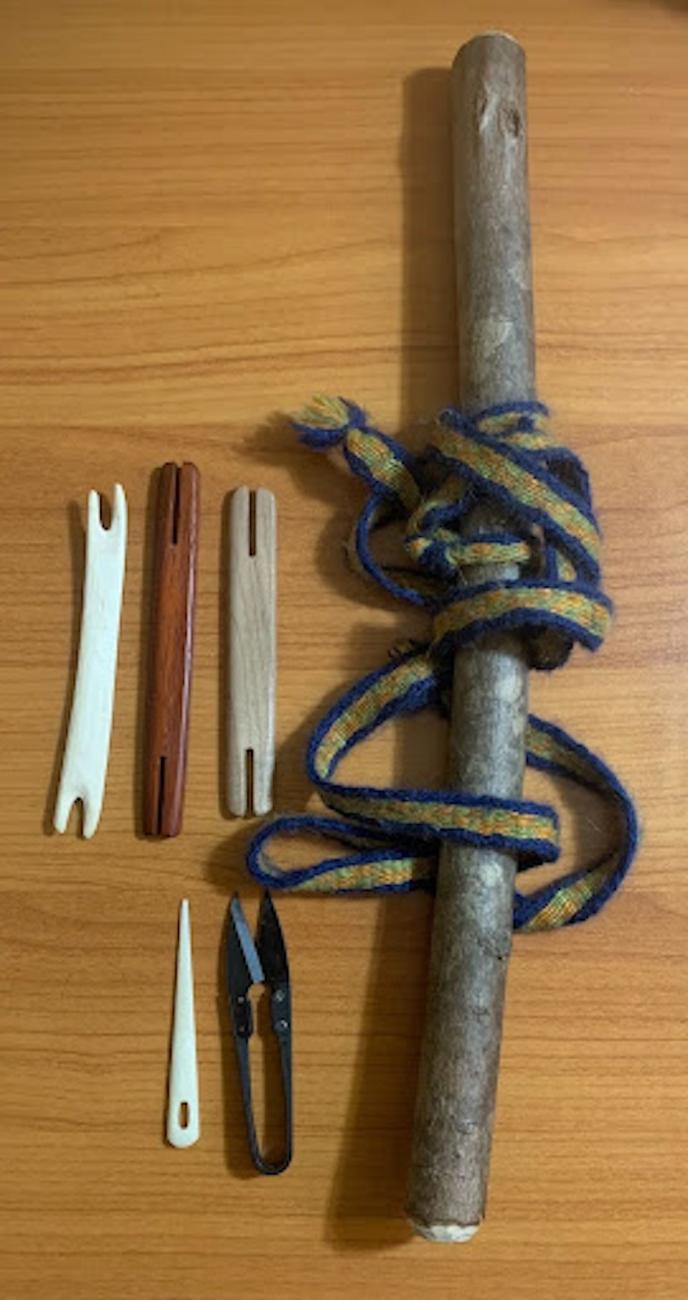 The final, and least used tools were a bone needle and shears. The shears are not recreations, but follow the morphology of ancient shears (Gleba, 2019, pp.234-235; Gleba and Mannering, 2019, p.7; Cutler, Demova and Gleba, 2020, p.18). The shears were used to measure the threads and cut them off the backstrap. The bone needle was used to weave in any loose ends or pick at specific threads. Both can be seen in Figure 8.
