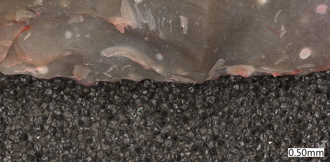 The frequency and location of individual micro-niche traps of biological matter - hereafter 'sites' - were recorded on an RTI (Reflectance Transformation Imaging) image for each biface. RTI images were selected as a rapid and accurate recording method: they allow key features, such as flake scars, to be easily located. For this preliminary study, the recording of an individual site does not vary according to the size or nature of the deposit of biological matter: it simply records the existence of a surviving continuous deposit of biological matter. Images of micro-niche sites were captured using a Keyence VHX-7000 digital microscope.