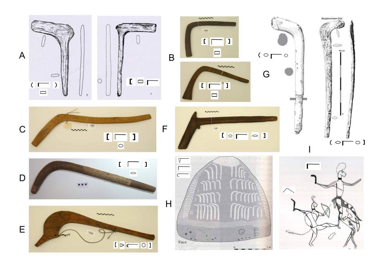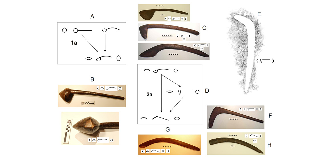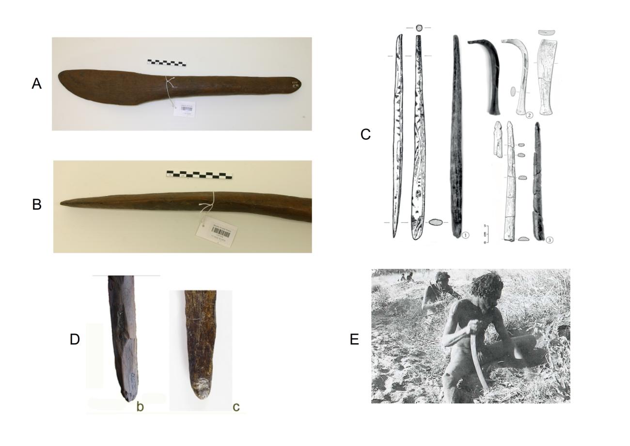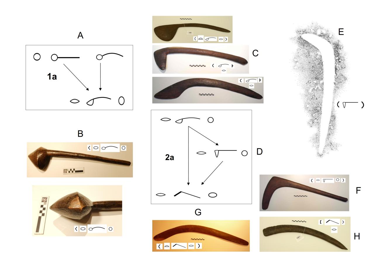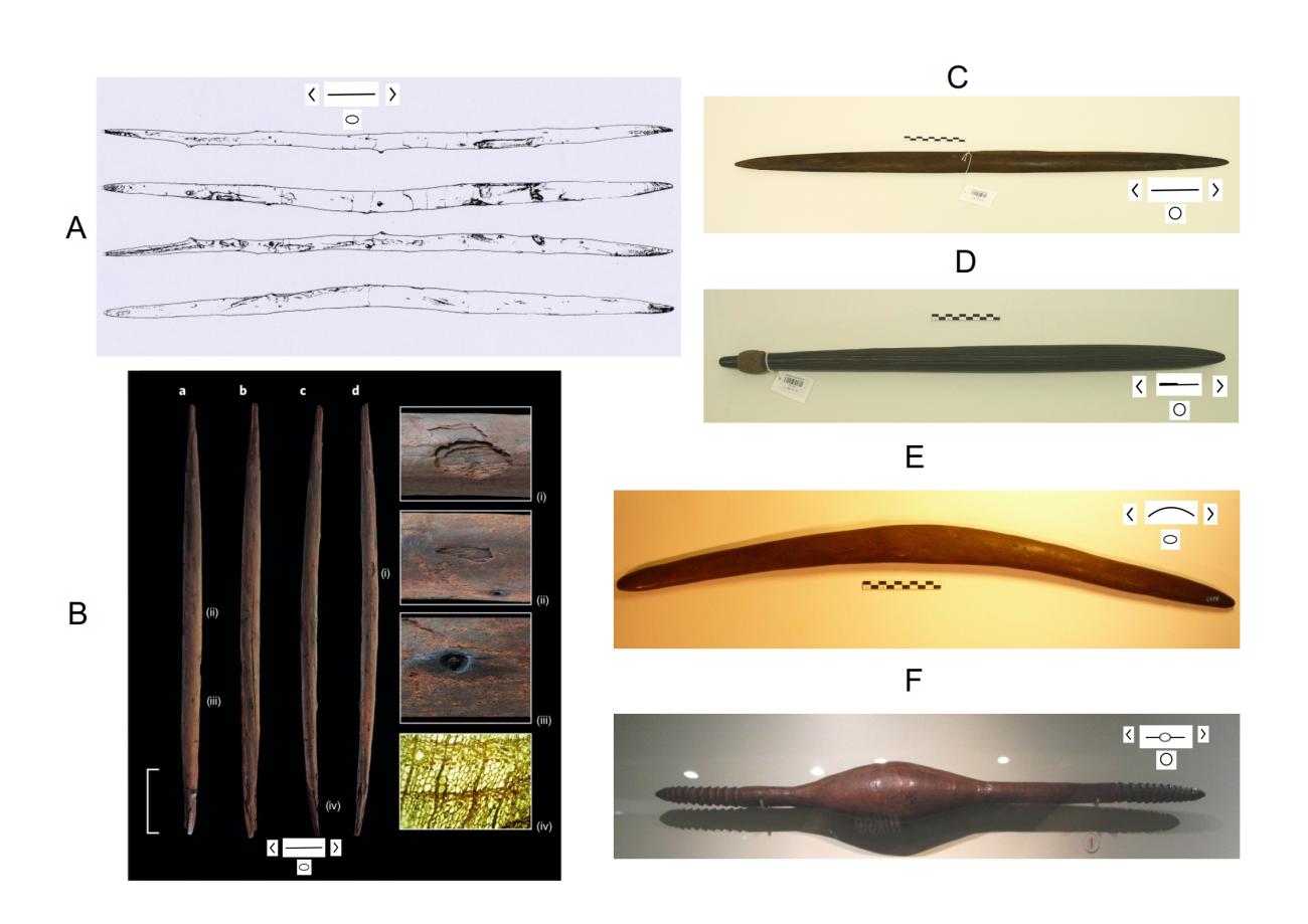 During phase II, low curvature was probably sufficient to stabilise heavy archaic double-pointed shaped sticks (See Figure 3, 1c), types of which are in ethnological records especially in arid regions of Australia (See Figure 5E). These solid objects also retain other contact functions, such as close fighting weapons and digging sticks.