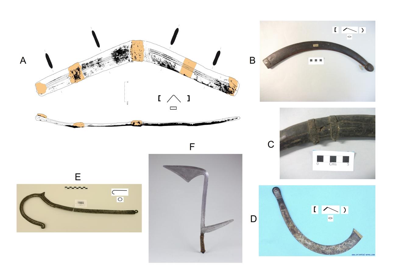 At this stage, concomitant with the development of metallurgy, copper alloys and iron starts to be used as new materials for throwing sticks, which are also manufactured with metal tools, contributing to their diversification and innovation in new types of sections and extremities. Iron starts to be used to reinforce or repair throwing stick blades as with the Urville-Nacqueville Gaulish artefact cited above (See Figure 11A) or observed on South Indian valari (See Figure 11B-C)(Bordes, 2015, 2021). This progressive shift from wood to metal could be observed on the Indian valari, which started to be made from composite materials, mainly from wood, but sometimes with the addition of metal parts such as the blades at their extremities. In a last step, South Indian people produced valari throwing sticks entirely in metal, directly inspired by wooden projectiles such as Indian katariya (i.e., valari) (See Figure 11D)(Hornell, 1924). Throwing weapons entirely in metal based on throwing stick technology were probably invented to further enhance the striking efficiency of these projectiles on large and dangerous game (e.g., tiger hunts in India with kateriya) or when used at war. It's also possible to follow such final evolution of throwing sticks to metal weapons in Africa, as crozier shaped metal small throwing sticks of an old design can be found (See Figure 11E), but also with completely new multi-bladed designs such as metal knives in Africa (See Figure 11F) (McNaughton, 1970; Childs, 2016). However, this final evolution of throwing sticks removes them from the scope of study as wooden projectiles.