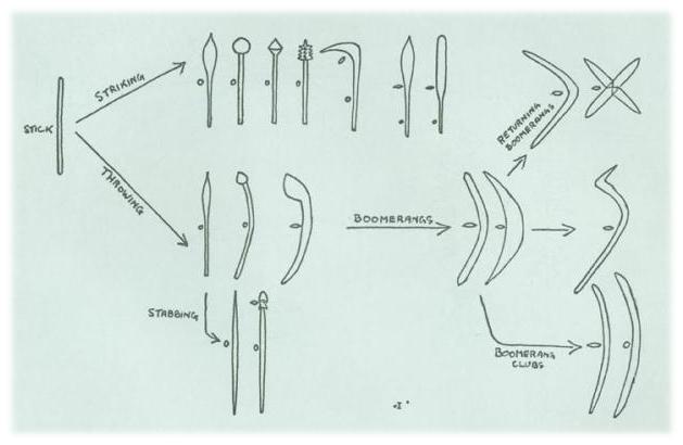 Confronted by the paucity of the archaeological record, a hypothesis on the evolution of throwing sticks cannot be based only on the rare preserved artefacts but also has to rely on more abundant ethnological and ethnohistorical data. Previous theories about the development of throwing stick technology focused exclusively on explaining the invention of boomerangs in Australia, so they focused on a particular type of specialized throwing stick. The famous antiquarian, Augustus Pitt Rivers, studied the evolution of these projectiles from prehistory to modern times and had a life-long interest in boomerang technology, studying ethnographic throwing sticks from Australia, India and Egypt. He experimented with many replicas, and defined four steps in the technological evolution of these objects thrown as projectiles to explain the appearance of the returning type (boomerang): a first phase of use of raw branches without modification, thrown in rotation; a second phase of discovering the stabilization by curvature, increasing range and accuracy; a third phase of cross-section improvement by splitting wood branches to create a plano-convex cross-section; a final fourth phase of improvement using throwing experience to control the returning flight (Pitt Rivers, 1883). Another study on the technological development of throwing sticks is the diagram of Bryan Cranstone, who was the curator of the Pitt Rivers Museum from 1976-1985. His diagram is more a functional typology than a scheme of technological evolution, and he focused on the functional specialisation of striking and throwing sticks (including boomerangs) (See Figure 1).