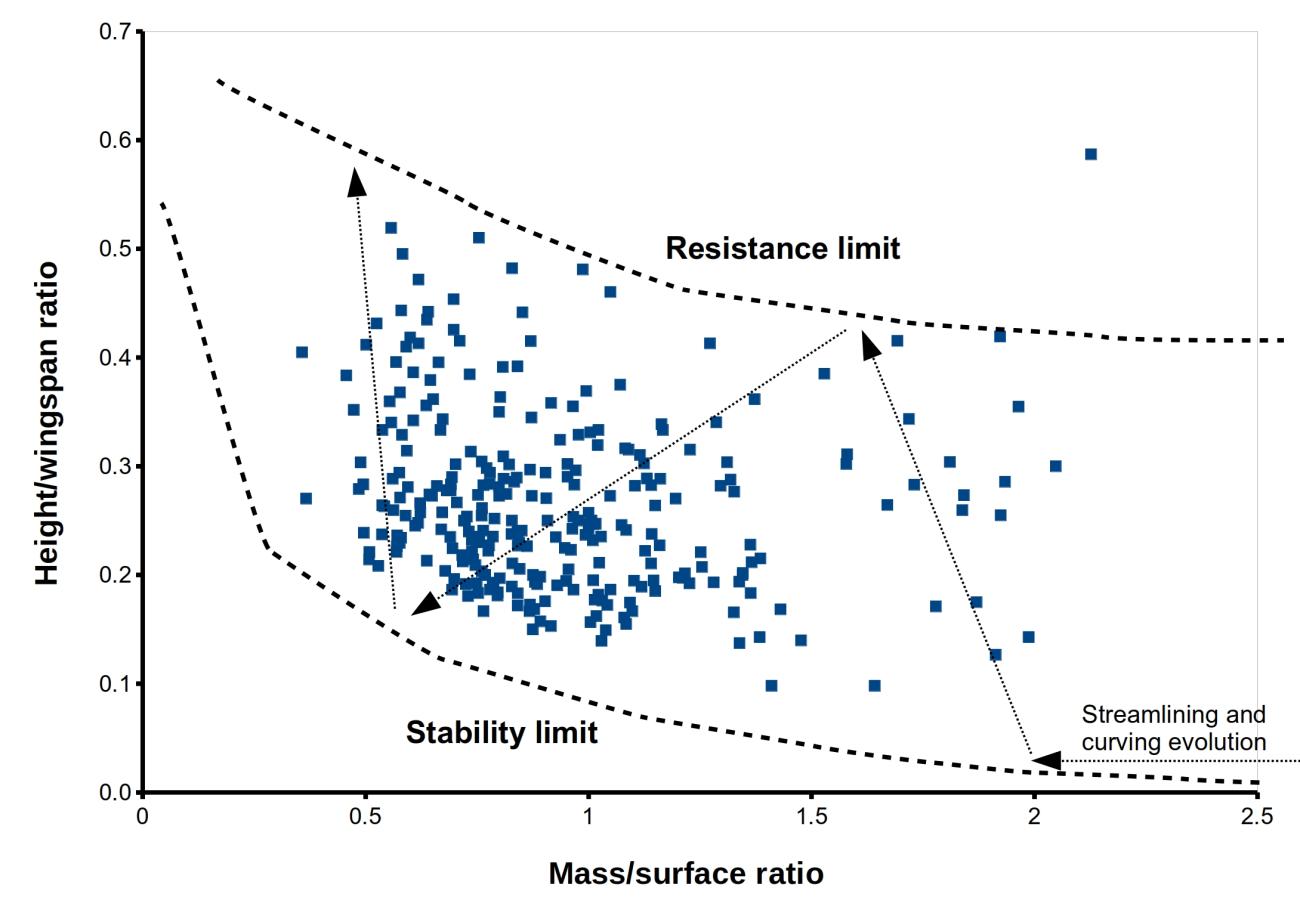 The technical solution is to create a curve or bend the throwing stick to restore stability. One possibility is to accentuate the curvature during manufacture, as can be found in the crafting of rabbit sticks by Californian Indians (Campbell, 1999). However, as it's rather difficult to bend most throwing sticks made of hardwood, it is easier sometimes to craft another one with the same streamlining, after first selecting a piece of wood with a more accentuated natural curvature. This selection mechanism, by eliminating unstable throwing sticks, leads to the accentuation of their curvature with increasing streamlining. Once a certain curvature is reached (height: wingspan ratio >0.2 according to my experiments), streamlining can be increased to a biconvex cross-section or (even more advanced) to a plano-convex cross-section with no instability problem if fitted blade tuning is applied. A diagram representing the measurement of the height: wingspan ratio (expressing curvature) against the mass: surface ratio (expressing the carrying surface) of museum throwing sticks, shows that lighter objects need to have minimal curvature, and a technological limit relative to curvature is determined (See Figure 2) (Bordes, 2009a, 2011, 2014). Interestingly, another limit can be observed on figure 2, as throwing sticks need also to limit their curvature to maintain minimal resistance (see section Blade streamlining of throwing sticks). Indeed, projectiles with sharper angles are more fragile and tend to break more easily. Both limits define an "evolutionary corridor" of compromise or trade-off between stability and resistance needed for throwing sticks.