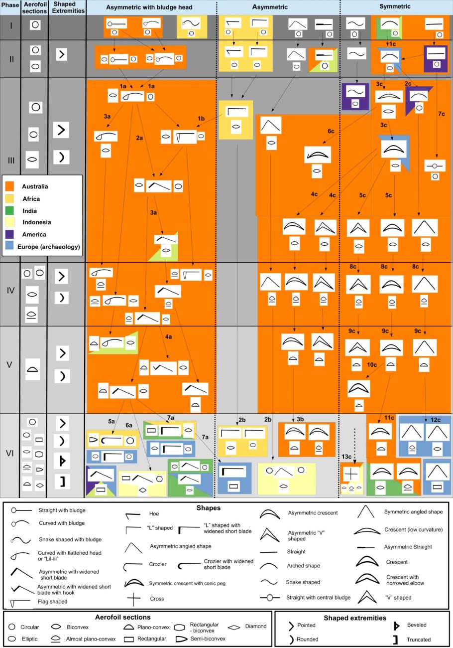 Here we present a proposal of a new evolutionary scheme for the three previously defined major group of archaic throwing sticks according to their type of symmetry and former functions, aiming to refine the technological phases previously defined by Pitt Rivers. An evolutionary diagram showing key innovations is presented in this section (i.e., improvement of cross-section, accentuation of curvature, wingspan reduction) and adaptation responses of throwing stick major groups (i.e., asymmetric with head, asymmetric, symmetric) and discussed. This evolution scheme is divided in successive chronological-technical phases illustrated by archaeological discoveries, rock art and characteristics identified in ethnological studies. Additionally, the contribution of non-projectile functions in particular evolutionary stages is highlighted. Its scope is not to cover systematically regional histories, as ethnological and archaeological data for certain types of throwing sticks and developmental phases may be absent on some continents. For example, in Australia, the high diversity of throwing sticks attests that they probably went through phase I to V, but some innovations of phase VI are under-represented on this continent. In contrast, numerous throwing sticks present in India and Indonesia mainly belong to phase VI, but some specimens with archaic aerofoil cross-section attest to earlier phases. Africa is certainly a continent with a very old evolutionary story of throwing sticks. Ethnological objects appear in a dotted manner in each defined phase, except for phase IV. In America, ethnographic throwing sticks tend to reflect only phases II and III and recent diversification of phase VI. Nonetheless, bias of sampling of the ethnological collections of throwing sticks needs to be kept in mind, as the overrepresentation of Australian artefacts in Museums. Relative chronological phases are distinguished by the evolution of section streamlining, which is also proportional to the effective removal of wood, hence the development of woodworking tool efficiency. Some archaeological discoveries will be cited here to illustrate each defined evolutionary phase, along with ethnographic examples. Dating of archaeological artefacts will be used to propose a coarse chronology of these phases. The three major categories of throwing stick symmetry (described above) are considered in terms of some specific classes of shape (Bordes, 2014) that help to establish a relationship diagram (See Figure 3). Table 1 summarizes possible innovations in each defined phase and the invention of new types of throwing sticks. It should be noted that ethnological throwing sticks have all been crafted during a recent period, consequently, to illustrate some evolutionary steps, some examples presented to illustrate ancient shapes and sections have yet recent extremity type (e.g., truncated or bevelled). Finally, this scheme is designed to be further adapted for different cultural and natural environmental contexts (e.g., availability of dense wood) and according to the range of non-projectile functions of throwing sticks in each area.