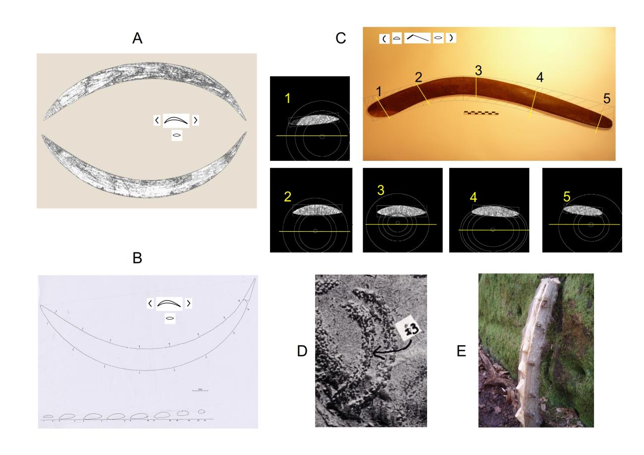 Although their preservation is rare, due to the perishable nature of organic materials (mostly wood), many archaeological objects discovered from historical and prehistoric periods have been identified as throwing sticks and boomerangs (Hess, 1975; Bordes, 2014). Paradoxically, compared to the abundance of ethnological information, there are very few reported archaeological discoveries of throwing sticks in Australia. The oldest find is the famous set of throwing sticks discovered at Wyrie Swamp in South Australia which has been dated to about 10,000 BP (Luebbers, 1975). On this site, excavations recovered a few artefacts of returning boomerang type and throwing sticks having an open asymmetric shape, similar to those used by Aborigines of this region in the past few centuries. Other discoveries are more recent in age, and can be directly related to ethnography, such as the boomerang from Clarence River NSW (McBryde, 1977), the 600 year old wirlki (a peculiar "number 7" or "gooseneck" shaped throwing stick traditionally made in the area around Tennant Creek by the Warrunmungu people and distributed throughout the central desert area of Australia) throwing stick found at Riwi cave (Langley et al., 2016), or throwing sticks found in the Cooper river bed near Innamincka (Roberts et al., 2022), dated between the 17th and 19th centuries.