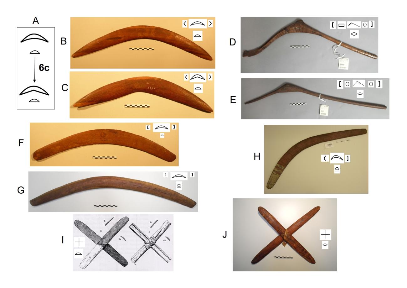 Asymmetrical projectiles with a distal bulge were more heavily modified in shape because the increase in surface affected the distal blade first, as the bulge head becomes flattened (See Figure 3, 1a), followed by a weaker streamlining of the proximal blade to keep the handling function. To minimize the accentuation of curvature on these objects (see section Curvature as a response to streamlining for flight stabilisation), which could lead to a decrease in their resistance, a solution is found by shifting the flattened distal head toward the interior of curvature, obtaining the type of shape of Lil-lil which are archaic throwing sticks found in Southeast of Australia (Davidson, 1936; Jones, 1996). A trace of this modification can be found on some throwing clubs in this particular area with the head decreased in thickness and shifted from a centred position related to the handle (See Figure 7A-B), which can be considered as a mid-step toward Lil Lil type of throwing sticks with flattened heads (See Figure 7C). Lil-Lil flattened heads can take a variety of shapes (round, semi-round, rectangular, square, and pointed) (See Figure 7C). The pointed head shape, another typical "flag" shape present in Southeast Australia (i.e., marpungy) (See Figure 7D-F). This is also frequently depicted in rock art in Europe (Cassen, 2012). These flag-shaped throwing sticks with flattened heads tend to have the distal following blade perpendicular to the long proximal handling blade, thus linking them closely to an asymmetrical "L" curved shape (See Figure 3, 1b), which could have influenced their development.