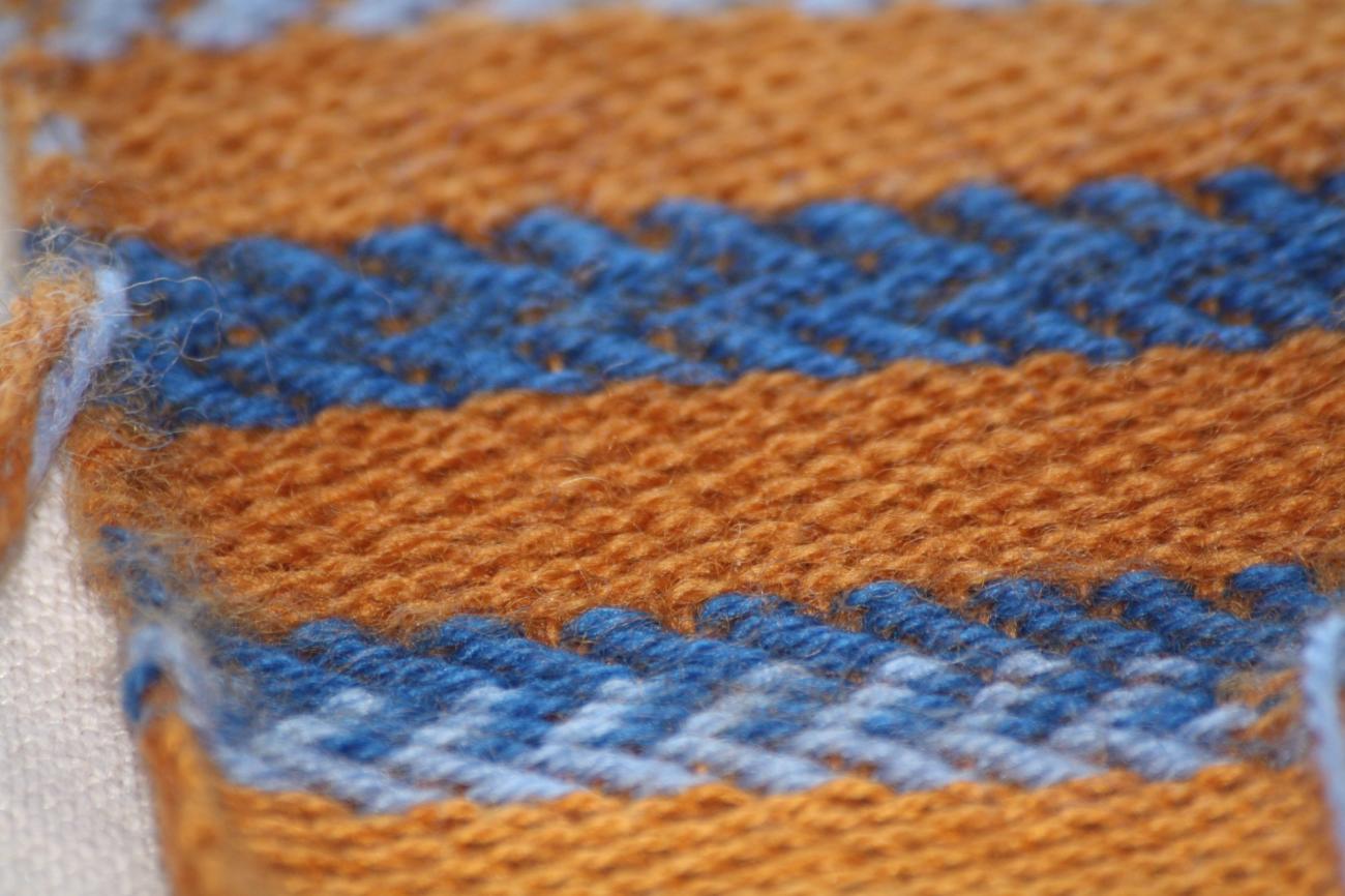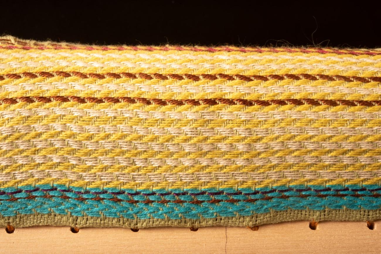 I was surprised and thrilled to see and experience that it was possible to weave 8-end satin with five rods on the warp-weighted loom. It did not require more time to weave a satin, compared to the amount of time it would take to weave a 2/2 twill or a 3/1 chevron twill. Both test weaves produced in this study, were warp-faced satin, with faced back sides (See Figures 1,2, 3, 4, 5, 6, 7, 8, and 9).
