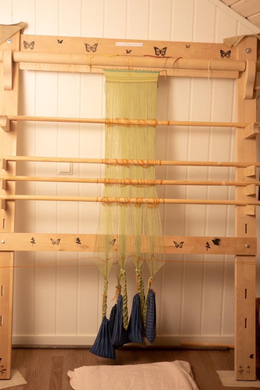 - I chained down the warp and stitched the starting border onto the beam on my warp-weighted loom (Olsen, 2014, pp. 64-67).
