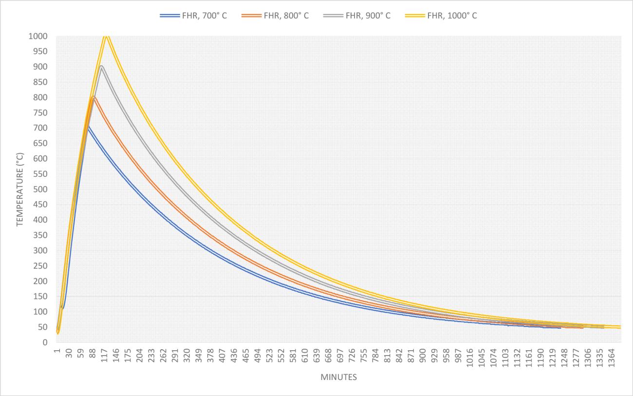 In the FHR controlled firings, the average rate to reach the maximum temperature of each firing ranged between 8.41-9.85° C/min (for the detailed characteristics of the controlled firings, see Table 4). However, regardless of the maximum temperature, the actual heating rate to reach the previous temperature thresholds was consistently the same (See Graph 2). For all VSHR firings in the laboratory, the maximum temperature was reached in five hours, and the average heating rate was below 3.33° C/min.