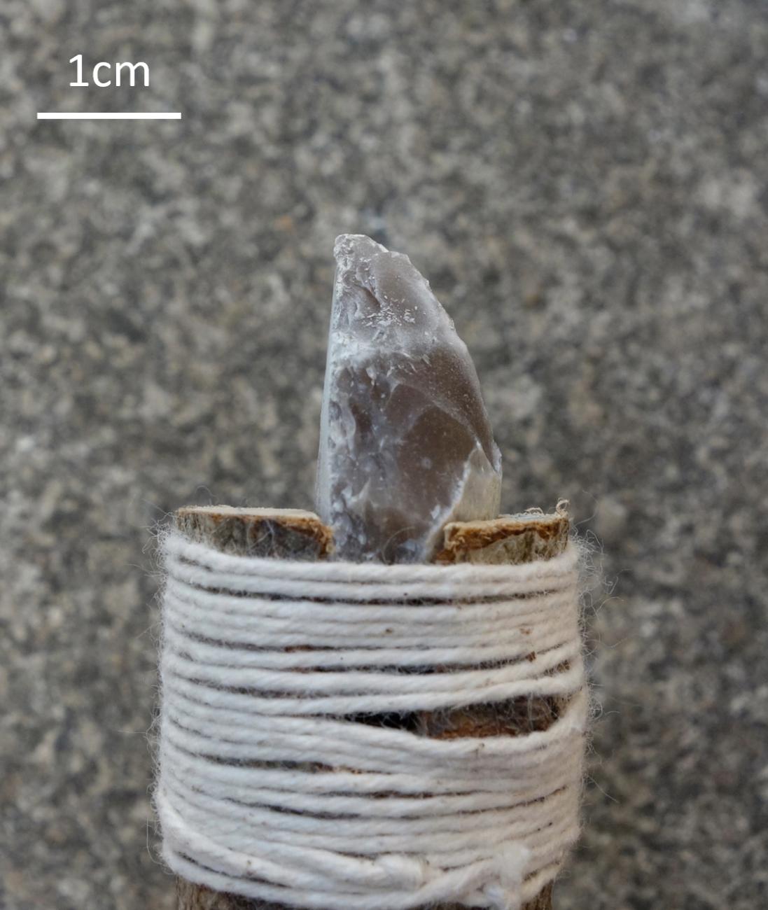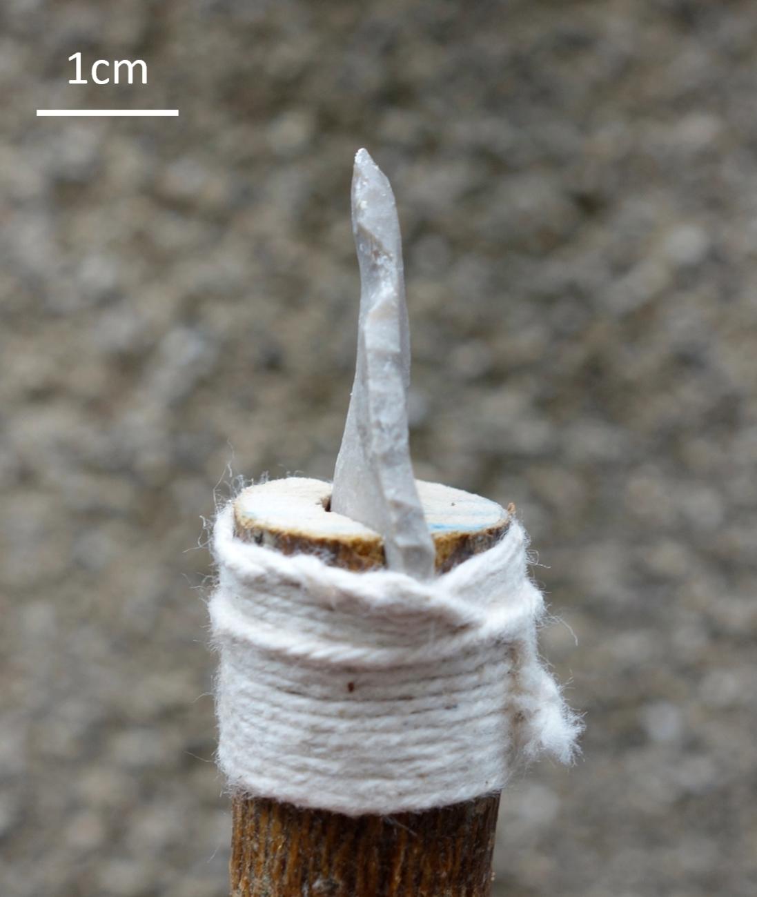It is worth recording one final observation made during the course of the experiments, this time regarding use-wear on the tools themselves. Tools made from thin-flake blanks (and to a much lesser degree those made from thick flakes) followed a consistent pattern of breakage through use: the force of the hard compact tissue at the perforation opening abrading against the lateral edges of the tool caused tiny chips to be periodically removed from those edges as the hole deepened, resulting in the formation of concave lateral working edges terminating in distinctive 'shoulders', whose distance from the tip of the tool corresponded to the final depth of the perforation (See Figure 14). One lithic perforator from Dąbki (See Figure 8:5 in Kabaciński and Winiarska-Kabacińska, 2023, p.9) exhibits precisely this form, indicating that it may have undergone the described pattern of breakage.