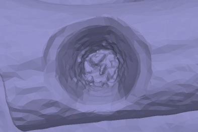 The models are also very useful for interrogating profiles: on every model the characteristic funnel or inverted mushroom profile was easily recognisable. Particularly valuable was the ability to view the perforation apparently inside-out, from within the antler itself, as though it were a solid object rather than a negative feature (See Figures 16c and d). This was found to facilitate visualisation of the perforation's 3D shape in a way that even an examination of the physical object itself could not match. It was also possible to create a half-section of the perforation by slicing the model vertically in two (See Figures 16e and f), another useful way of inspecting profiles virtually that would be impractical to replicate on the physical object. For viewing profiles 3D models are vastly superior to traditional alternatives: the practical challenges posed by such small holes make it impossible to photograph, and difficult even to accurately draw, the profile in full. Thus, the models proved very useful for the analysis and presentation of morphologies, despite their relatively low-resolution reconstruction of surface shape.