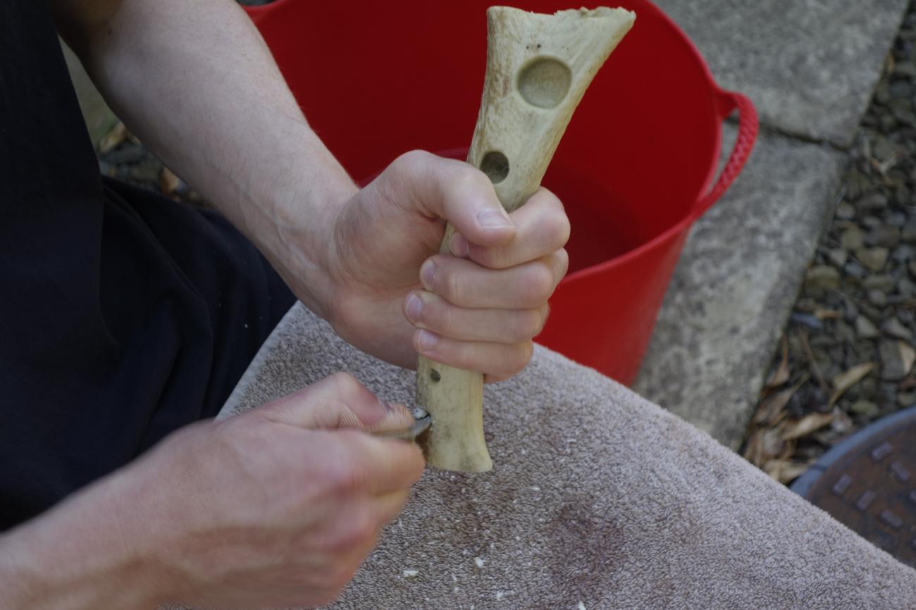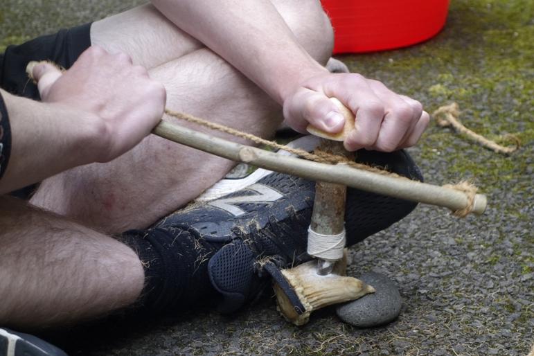 This conclusion provided the impetus for a series of experiments in which flint tools were used to perforate red deer antler. Rather than replicating specific lithic forms attested in the archaeological record, the decision was made to use the simplest possible form capable of doing the job; a simple flake, minimally retouched at the distal end so that it tapered to a central point. The aim of the experiments was to investigate the traceological consequences of manipulating specific technological variables. The first variable was the means by which the flint tool was set in motion, which was either by hand or using a bow drill. In hand boring, the point of the flint tool was pressed into the surface of the antler and, applying continuous downward pressure, rotated alternately clockwise and anticlockwise by hand until a hole was produced (See Figure 5). In bow drilling, the flint tool was hafted onto a drill shaft of wood that was then set in rotary motion using a bow, with the flint drill bit inserted into the antler (See Figure 6). These are essentially the first two of the three perforation techniques identified by David (2008, pp.83-90) and discussed above using her terms 'boring' and 'drilling'. It was considered important to revisit these already-documented techniques in order to test the repeatability of the reported results and to see if they could be further refined.