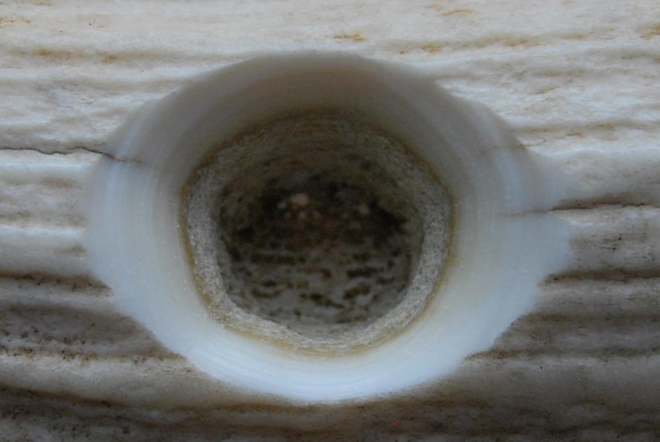 Hand-bored and bow-drilled perforations were readily distinguishable by the character of the striations observed on the surfaces, particularly of compact tissue, that had been abraded by the perforating lithic tool. Striations produced by bow drilling tended to be longer, horizontal, and parallel (See Figure 10), whereas those produced by hand boring tended to be shorter, oblique, and converging to intersecting (See Figure 11). In sum these differences amount to two quite distinct visual impressions, the striations on bow-drilled holes appearing very neat and regular, whereas those on hand-bored holes are rather messy. These differences are readily explained by the experiments. The mechanics of bow drilling are such that each single stroke of the bow, either back or forth, effects multiple full rotations of the drill bit in a single direction; when hand boring, each twist of the flint tool produces a rotation of at most around 180°. This explains the observed difference in the length of striations. Similarly, when bow drilling, an angle close to 90° is consistently maintained between the axis of perforation and the worked surface; but when hand boring, that angle is liable to vary slightly because the hand and wrist do not rotate perfectly about a fixed central axis. This explains the difference in the angle of striations.