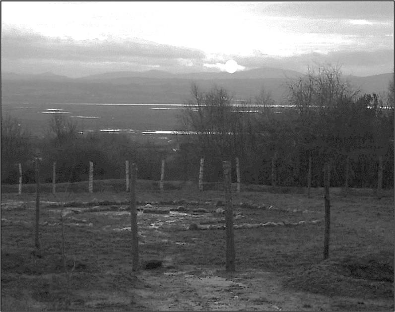 Incidentally, I only added a few of the standing stones to the experimental henge to represent the Heel Stone, the Slaughter Stone, the recumbent Altar Stone and the four Station Stones. Also, five small uprights were positioned to represent Stonehenge's Trilithons whilst 30 recumbent slabs accounted for the Sarsen Circle lintel stones. I carefully positioned the henge so that it not only incorporated a number of important astronomical alignments that occur at the real Stonehenge but also aligned Nesshenge's north-east entrance (and the respective view across the henge) towards a special 'notch' amongst the south-west horizons, between the Welsh mountains of Moel Famau and Moel Arthur. Indeed, standing at the Heel Stone and looking across the north-east entrance on the winter solstice (21st December) one can watch the afternoon winter sun setting between the two mountains (See Figure 5).