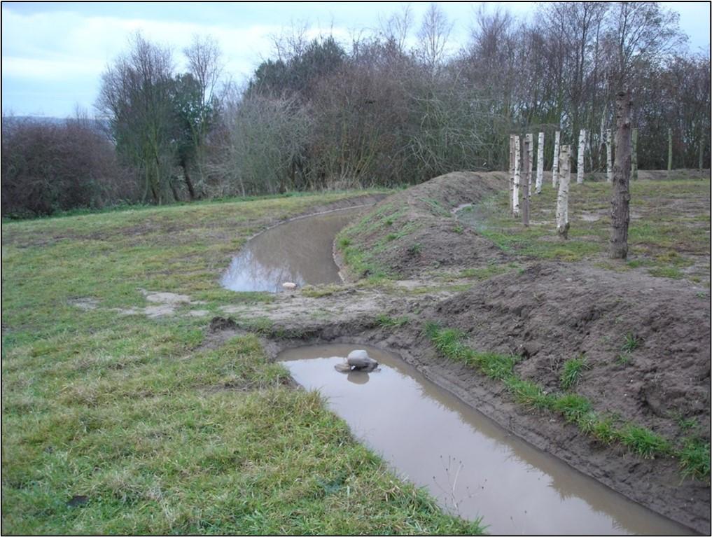The experimental henge came under attack from the elements almost immediately after construction. Within days heavy rain caused the ditches to flood, and they remained flooded throughout the winter of 2008 (See Figure 6). Interestingly, this flooding made me think about the purpose of henge ditches - were they all deliberately built to be flooded in this manner? Perhaps they were a source of water for the cattle that were herded by the farmers when congregating at prehistoric henges for trade, feasting and exchange; alternatively, the flooding may have contained some cosmological meaning linking sky, water and earth at the henge (see Richards, 1996). Or the water might have been used for ritual bathing by the people gathering at the henges (Hill, 2009a). Certainly, the incorporation of water as a natural element within the architectural design of a Neolithic henge is known elsewhere. For example, at Wiltshire's Marden henge, there, the river Avon was actively forced to flow into segments of its ditch, forcing it to remain in a permanently waterlogged state (see Wainwright, 1989). Notably, Nesshenge has similarly done so since 2008.