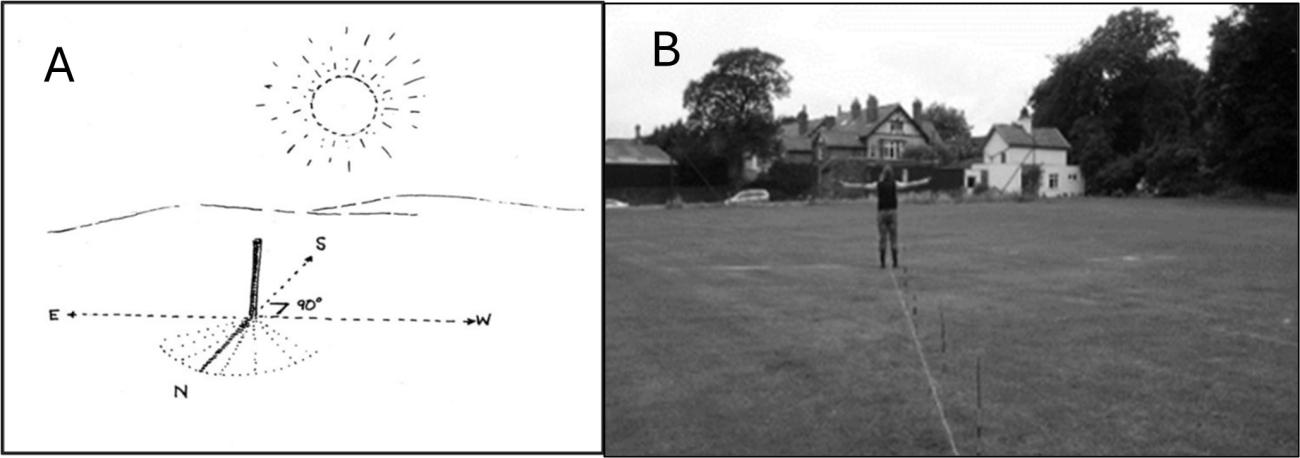 The first "job" with construction was to clear the land upon which Nesshenge would stand. This involved strimming weeds and mowing grass. Fortunately, there were no large trees or excessive shrubs to clear. With the land surface cleared, I then used my methods of setting out with the 67 ½ ft (20.5m) length of rope being used to mark on the ground the circumference of the henge's Outer Ditch. Wooden poles were then pegged out along the perimeter of that circuit. Next, standing at the centre of this ring, I measured the sun's shadow to identify a north/south line for the direction of True North (See Figure 3A). Then the other cardinal points were obtained by asking a gardener to stand on the north / south line and hold out both their arms parallel to the ground whilst facing True North: thus, the right arm pointed east and the left arm, west. This action then identified the east and west cardinal points on the circumference of the outer ditch made by the 67 ½ ft (20.5m) rope (See Figure 3B).