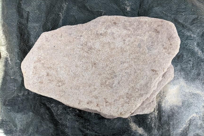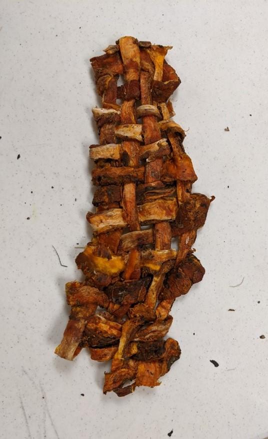 After the raw and roasted pumpkins were cut into 1 1/2in rings, they were hung from a rod and elevated off the ground with two lawn chairs outdoors in Wichita, Kansas, USA, for six days in October 2021 (See Figure 12). The raw and roasted pieces were then cut with a lithic flake and flattened by hammerstone to pressthe rings into strips. Once the rings were flattened, one mat was woven from the raw and roasted strips, respectively, in a simple basketweave pattern. The woven mats were returned outside to continue drying. The raw pumpkin mat developed mould due to the cloudy weather and high humidity in the first two weeks, but the roasted mat was not affected.3 After 25 days from the initial drying, the mat woven from the raw pumpkins was discarded due to mould; the roasted mat, however, was thoroughly dry and weighed 200g (See Figure 13). The roasted mat then hung in an interior window of the Archaeology of Food Laboratory at Wichita State University for one year, in which time it never developed mould or any signs of deterioration, though several small pieces were sampled for sensory evaluation over the year (See Figure 14). This storage period was chosen simply to observe the stability of the dried pumpkin in indoor conditions.