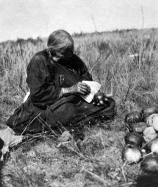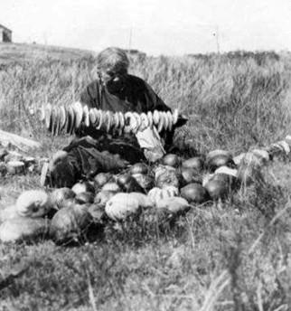 "The pumpkin rinds were removed by roasting them in the fire until they could scrape off the outer rind with a fresh-water clamshell. Each individual pumpkin was roasted and set to cool, then scraped. Some people peeled them with a knife, but this was time-consuming and was considered wasteful. Small pumpkins 4 inches or less in diameter were neither roasted, peeled, nor halved-they were simply cut into blocks, laid out on a tent skin and dried. They could be cooked any time now with the large roasted corn to add flavor. The standard-size pumpkins were cut in half, the pulp and seeds taken out, and the halves cut into a series of circular rings each about 11/2 inches wide. They were hung on a rack and when they had dried somewhat were pressed underfoot to express some of the water as was done with the sliced buffalo meat, then hung up again to dry further. At night the pumpkin rings were left on the rack covered with an old tent skin. By the time the mature dried corn crop was coming in, the pumpkin strips would be dry enough that they could be woven into checker-plaited mats. They would alternate the processing of this corn with the making of the pumpkin mats, ri-katsitu "braid-woven".