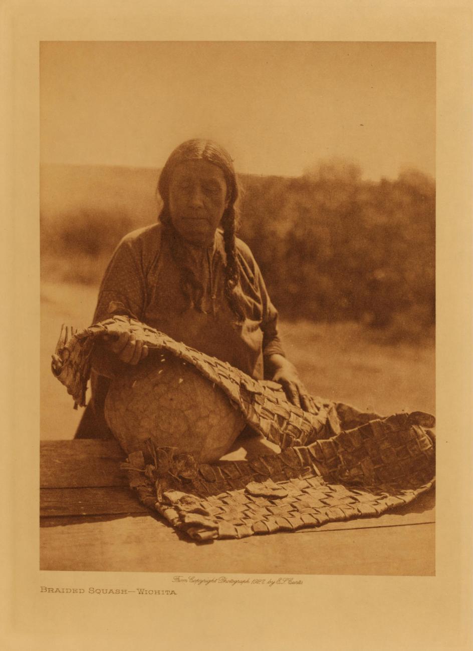 Although these are the only two surviving ethnohistoric records for plaited pumpkin mat production, it has been assumed that this was a common practice among a variety of Great Plains peoples. For example, while a narrative on pumpkin processing was not recorded for the Wichita, Edwin Curtis photographed a Wichita woman with a beautiful, tightly woven pumpkin mat in 1927 (See Figure 3).