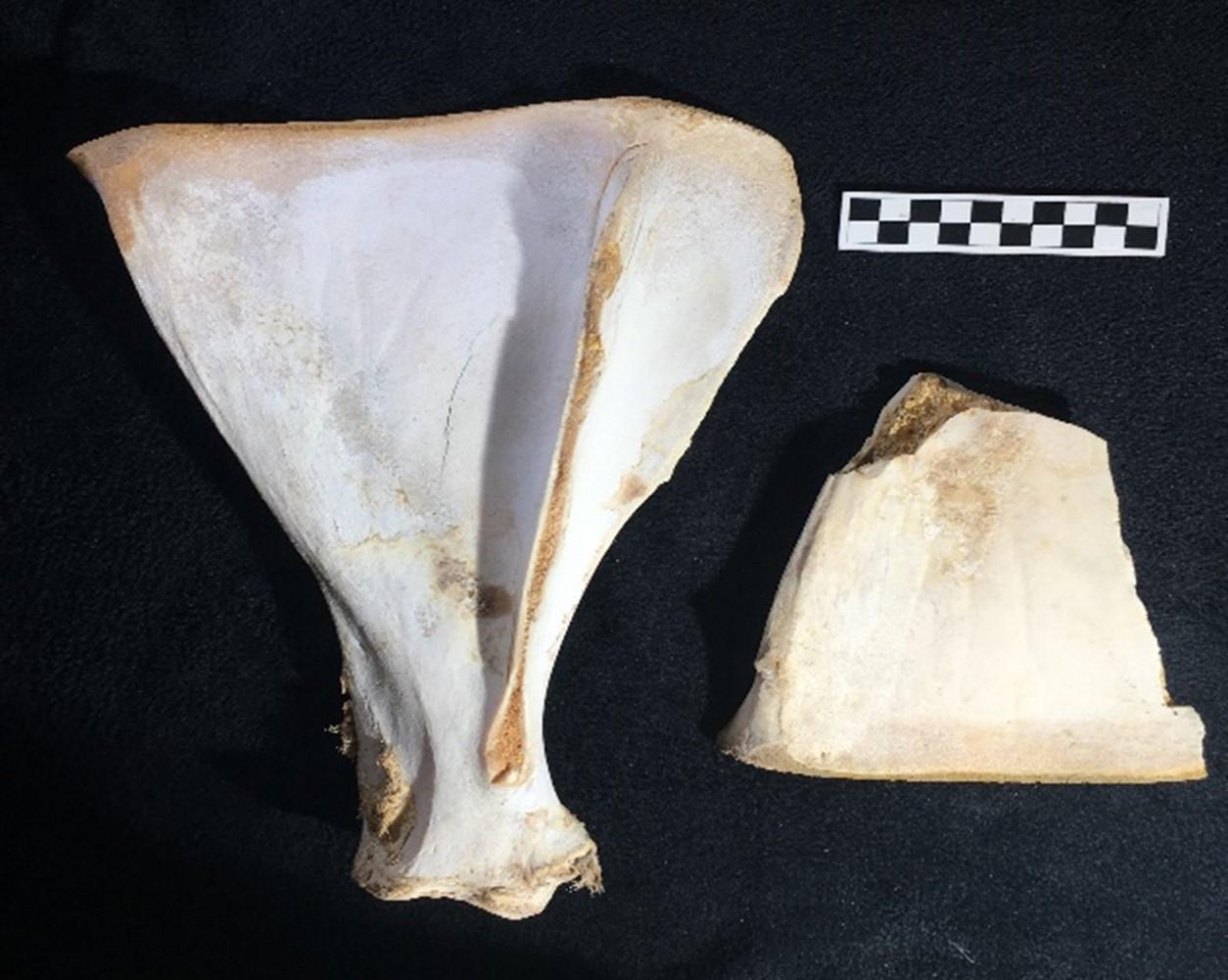 Bison scapulae were used to create bone knives. Bison scapula (No. 1) had no flesh on the bone and was aged, which accepted good scoring from a stone tool. First, the spine from the dorsal side of the scapula was removed by scoring the bone using simple flake tools. After scoring, the spine was removed by striking the bone using a hammerstone. The bottom portion of the scapula was removed by scoring the bone with the same tools and striking the bone with a hammerstone against a grinding stone, which was used as a base. After removing the spine and the distal edge, the grinding stone was used to sharpen the scapula. The scapula was angled while sliding the scapula across the grinding stone with a back-and-forth motion to create a sharpened bevel edge.