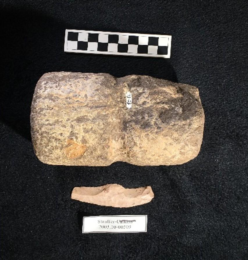 The cow scapula (No. 3) had meat residue and sinew on the bone which required de-fleshing. The stone tools used for scraping proved to be very difficult. After removing the flesh to expose the bone, the same stone tools were used to score the scapula on both sides of the scapular spine. The scapula was held on the grinding stone while being struck several times with a hammerstone. This proved unsuccessful, so the scapula was flipped to the opposite side and struck several times. This process was repeated; however, the bone did not break, and it was determined that the bone was too flexible and raw for tool manufacture.