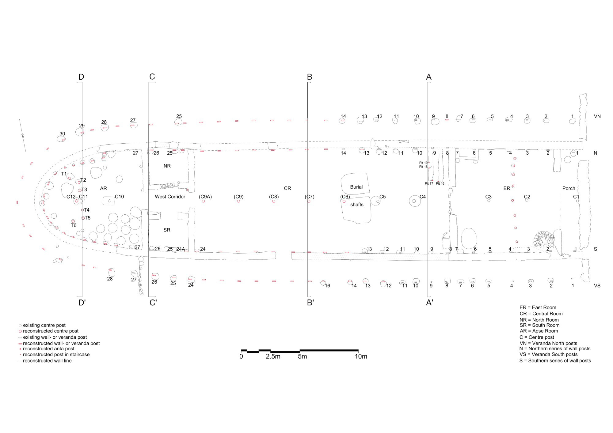 Posts N3, S3, VS4, VS5, VS8, VS9 and VS11 are skewed; post N4 is misaligned, being located c.0.2 m from the wall (Popham, et al., 1993, pp. 28, 39, table 2, pl. 38).