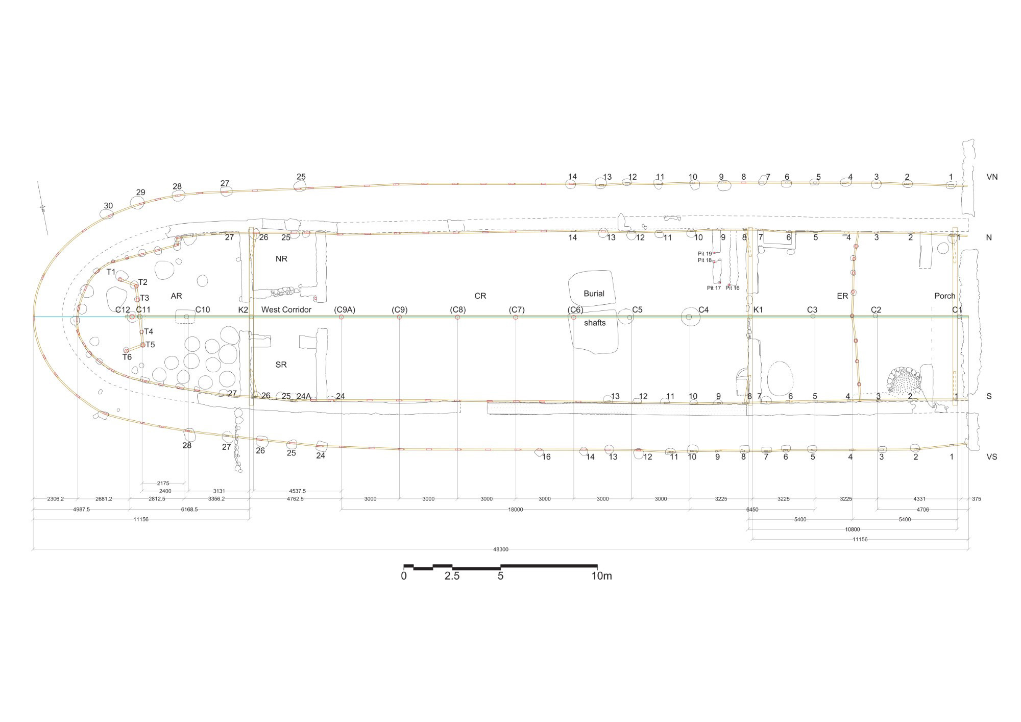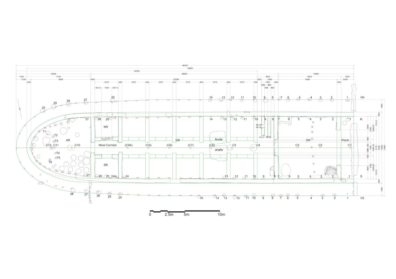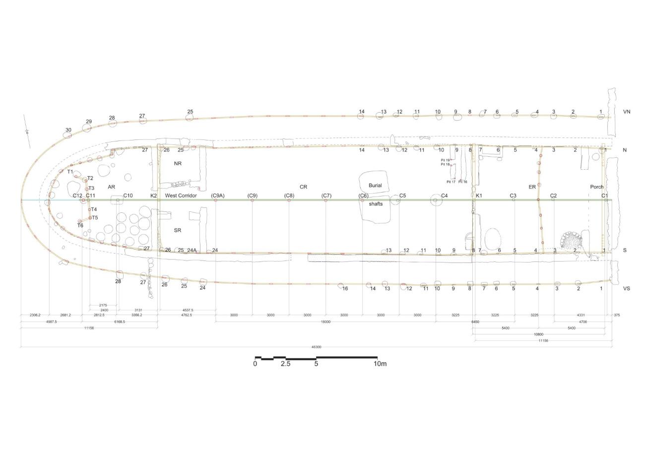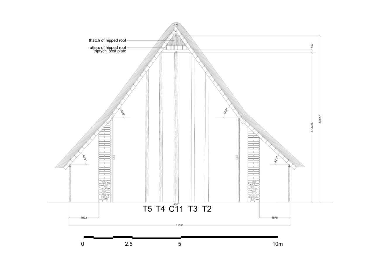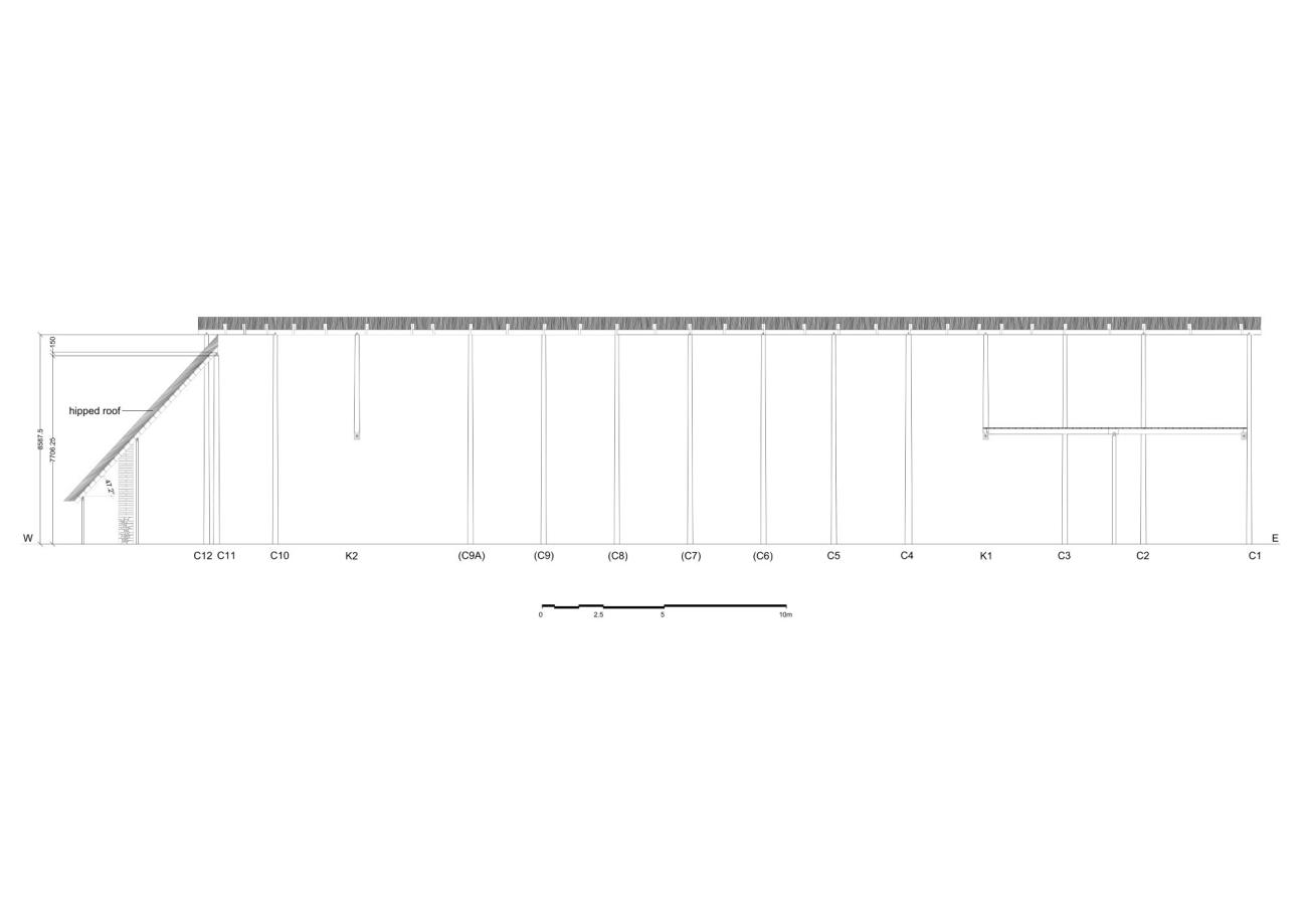 Having established the use of a combination of centre posts and king posts for the support of the ridge beam(s), we can now reconstruct the intervals between the timber uprights on the long axis of the building as shown in Figure 10. This figure shows that the division of the building's interior into three main spaces (front-central-rear) separated by partition walls that included doorways, according to our reconstruction, played an important role in determining both the intervals between the ridge-supporting posts on the long axis of the building (and, by extension, their corresponding intervals between the wall- and veranda posts) and the intervals between the last centre post (C12) and the two wall- and veranda posts on the long axis of the building. Thus, a symmetry would have been created in the timber frame between its front and rear parts (both equal to 11.156 m) on either side of its central part (equal to 25.987 m) and, within each of these parts, the axial intervals would have been determined according to structural and other needs. The figure also shows that the intervals between the ridge-supporting axial posts would have been measured from edge to edge of post rather than from centre to centre of post.