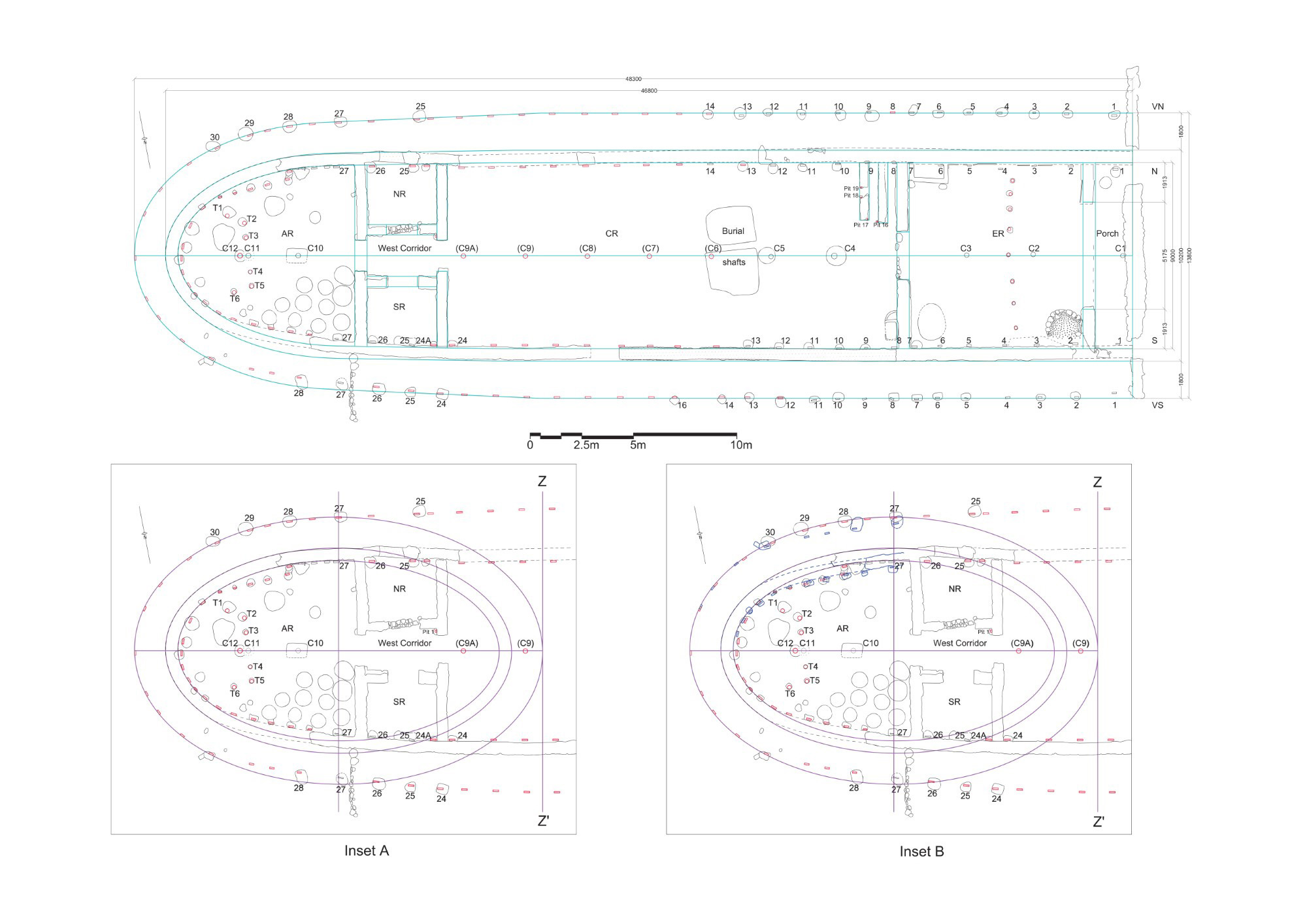 Including the veranda, the LK-T building would have measured 48.30 m x 13.80 m. Its reconstructed length - based on a geometrically generated triple-contour ellipse drawn for the ideal contours of the apse wall and its surrounding veranda, which are mostly missing - measures three and a half times its width throughout most of the building (except at the west end, where the building narrowed), as shown in Figure 2 with Inset A (the dimensions shown in Figure 2 and in the following figures are multiples or subdivisions of a foot of 0.30 m, a plausible local unit of length2). This is therefore the largest Early Iron Age building and the largest megaron known to us from ancient Greece. With its monumental size and megaron plan, as well as its surrounding posts in the veranda and its eastern orientation, the LK-T building is strongly reminiscent of later Greek temples.