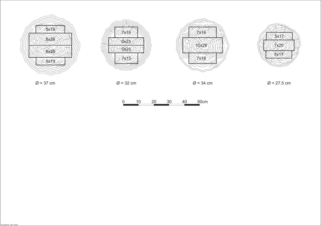 For the conversion of the logs to squared timbers, the logs would have been marked with lines along their length using a cord covered in powdered pigment, such as chalk or ruddle (red ochre) (Singer, et al., 1956, fig. 352; Bayford, 2001, p. 13), and then sawn through and through along the marked lines, following the method of 'plain sawing'. In this method, the log is 'slabbed', i.e. cut out into 'slabs' or 'deals'. The various dimensions or 'scantlings' (i.e. widths and thicknesses) of the rectangular wall- and veranda posts75 would have been produced by slabbing logs from average-sized trees (c.27.5-37.0 cm in diameter), a single log being able to produce either four 'deals' (of which two pairs with the same scantlings) or three 'deals' (of which one pair with the same scantlings) (See Figure 13). 'Plain sawing' is the fastest and easiest method of cutting timber, but also an essential method for the economic conversion of tree trunks, since one trunk can produce a number of sizeable timbers of a rectangular cross-section with the least amount of waste;76 however, the outer 'slabs' (the 'slabs' near the top or bottom of the end surface or 'end grain') of plainsawn logs are prone to warping (cupping) and only the centre slabs (the 'slabs' from the middle of the log's end grain) 'will remain perfectly flat' or will show minimal distortion.77 Since the vast majority of the (surviving) squared posts at LK-T appear to have been straight (at least in their parts within the post pits) and have dimensions such as to suggest that they come from the central part of the logs shown on Figure 13, it is reasonable to assume that the carpenters were well aware of this fact. The refined method of plain sawing would also have been used for the boards forming the treads of the staircase and the floors of the loft and the mezzanine (cf. Ulrich, 2007, p. 236, fig. 11.16). The LK-T carpenters would therefore have benefited from (or ushered in?) a major advance in construction technology by converting whole logs into squared timbers based on the principle of 'slabbing', thus skilfully optimising the potential of the wood as building material. The sawing would have been done by two sawyers using a 'cross-cut saw' (or 'two-handed saw')78 or a large 'frame saw' operated over a saw-pit (Singer, et al., 1956, fig. 357; Meiggs, 1982, fig. 14d) with one man pushing and the other pulling, in an up-and-down movement.