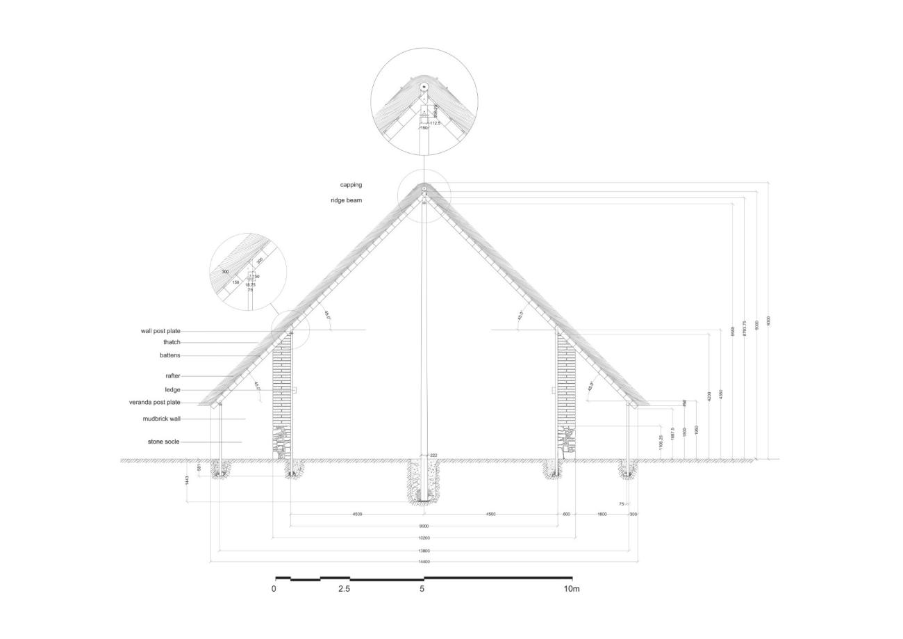 As regards the pitch of the gabled roof, a thatched roof must be steeply pitched to ensure maximum water runoff with minimum penetration into the thatch coat and thus avoid the rapid decay of the latter (Hall, 1988, p. 9). The pitches of thatched roofs in northern European timber-framed buildings are between 45° and (in areas with heavy snow) 60°, and especially those of reed thatched roofs between 45° and about 50°.51 Since the question of the roof pitch is at the same time the question of the respective heights of the different posts supporting the roof and, here, also of the veranda (the latter being restrictive and not favouring very high pitches), one can assume the minimum required pitch of 45° for the reed thatched, gabled roof of the LK-T building, with the veranda roof built as an extension of the main roof. In that case, a height for the veranda posts (to the underside of their plates) equal to 1.80 m, gives: a minimum height of roof (to the lowest point of the veranda rafters) equal to 1.69 m, which is reasonable; a total height of 9.30 m for the building (up to the apex of its thatched roof); a height of 9.0 m for the timber frame (up to the top of the rafters' crossing on the ridge beam), which is equal to its width (and the internal width of the building);52 the heights of 8.79 m, 8.58 m, 3.67 m, and 4.20 m, respectively, for the ridge beam (to its top), the centre posts, the walls, and the wall posts (to the underside of their plates) (See Figure 7); and a height of 4.275 m from the floor to the underside of the crossbeams, two of which would have supported the floor joists of the loft (supra) (See Figure 8). Interestingly, 4.275 m is also the height of the second landing of the staircase that would have given access to the loft over the ER and the Porch, according to our reconstruction (See Figure 8),53 thus making likely the reconstruction of the loft at a height of 4.76 m from the floor.54