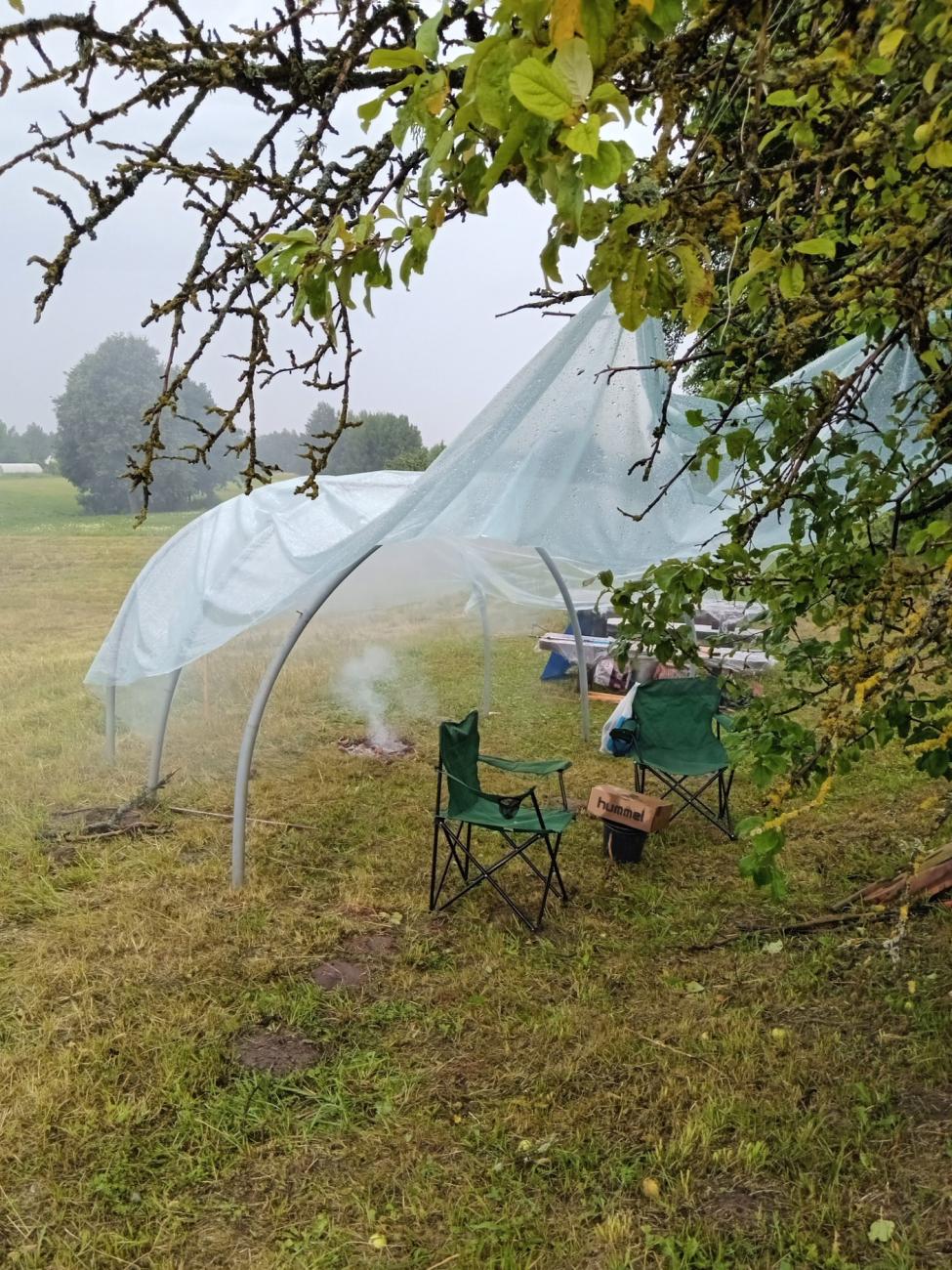 The next morning a small fire was lit to dry the furnace. The day was clear until a thunderstorm formed in the late morning and continued until early afternoon. A polytunnel was erected to protect the furnace and the worksite. However, by mid-afternoon the storm had subsided, allowing time for everything to dry and to be ready for casting when the festival started at 5 pm.
