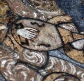 In the left nave, different forms of lutes are depicted. One of them has a holly leaf shaped body ending with a straight edge and a narrow round neck, no visible pegbox, no soundholes, two double strings (See Figure 7). It is very similar to the horsehoe-shaped "lute" in Cefalù. Another lute shows a straight pegbox and pegs very similar to those of modern loutar.