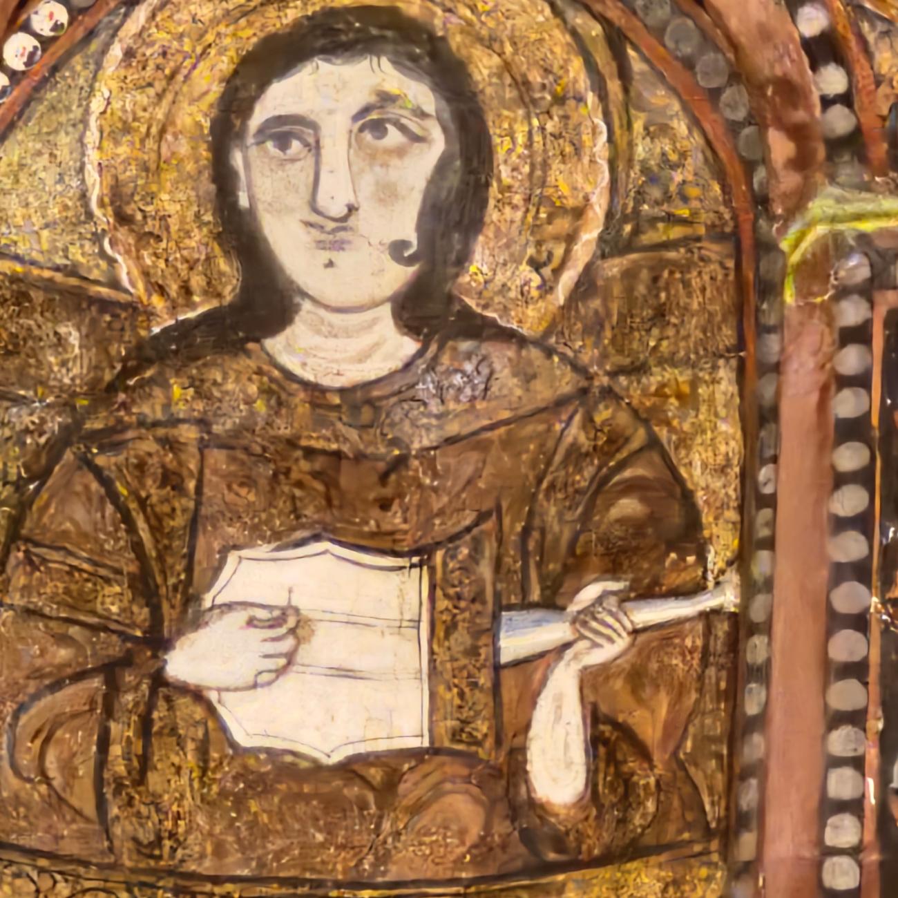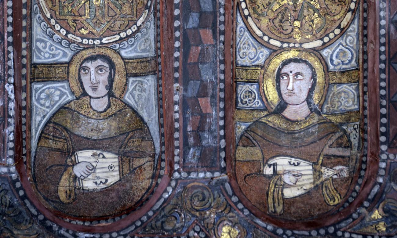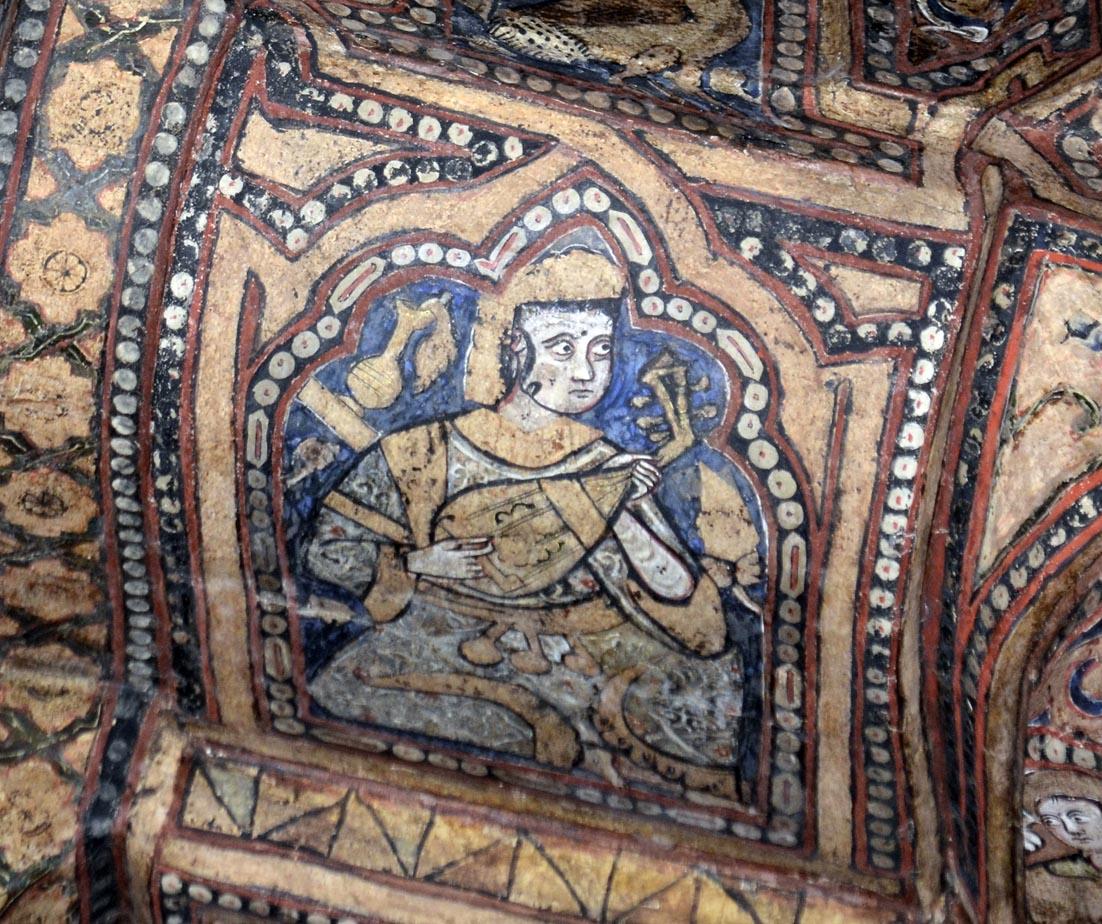 Some of the paintings are visible today on the wall at the entrance of the Museum of the Cathedral, but they do not depict human figures. The others, documented photographically in a single publication (Carapezza, 1994), are located among the beams of the central ceiling of the church. The conservation state of the paintings, which seem to have never undergone restoration, appears mediocre. The depicted instruments are large four-course lutes, small three-course lutes almost identical to those seen in the Palatine Chapel, plus a peculiar lute with a horseshoe-shaped body. There are also depictions of mermaids and dancers. It is suspected that these fragments belonged to a previous building, integrated into the Christian church, which would have allowed them to survive, relegated to an inaccessible location. It would be desirable to place them in the Museum, after adequate conservation and restoration work.