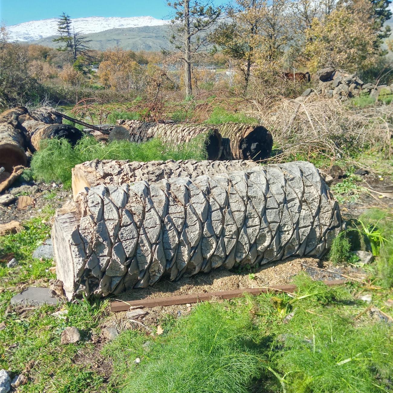 The palm in question can be identified as the date palm (Phoenix dactylifera). The very similar Phoenix canariensis grows abundantly in Sicily, although currently threatened by the spread of a parasite (Rhynchophorus ferrugineus). For this reason, many plants have died and have been cut down in recent years (See Figure 11). The trunk of the date palm, like that of all palms, is a material that cannot be properly called wood, being composed of spongy tissue reinforced with a dense network of fibers. In fact, botanists liken it more to grass than wood. This material has no practical use in woodworking or construction, and seemingly much less in lutherie. Thus, I began the work despite the negative opinions of many experts, but the surprises were positive from the beginning. The trunks I had chosen had been on the ground for some time and were heavy and very moist inside.