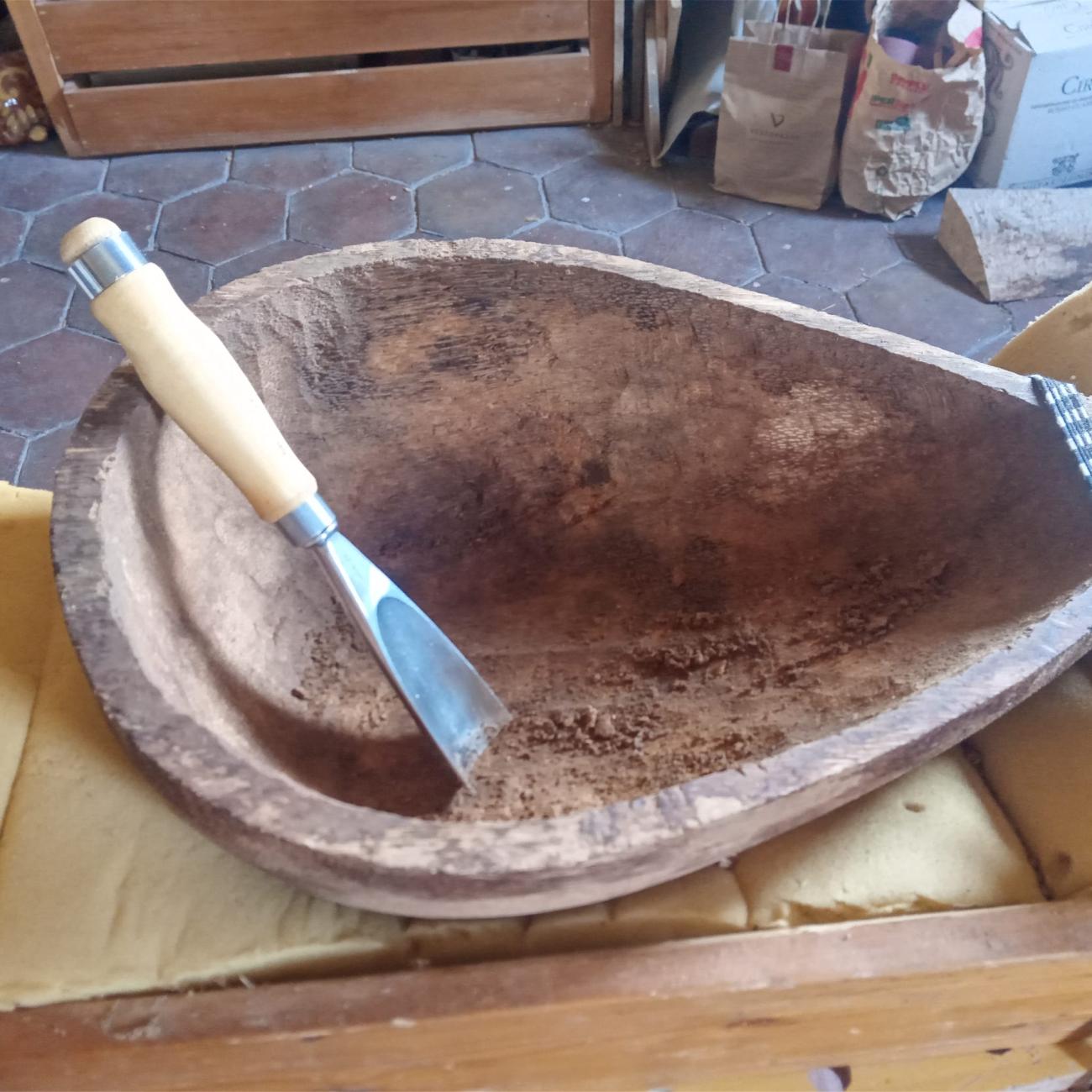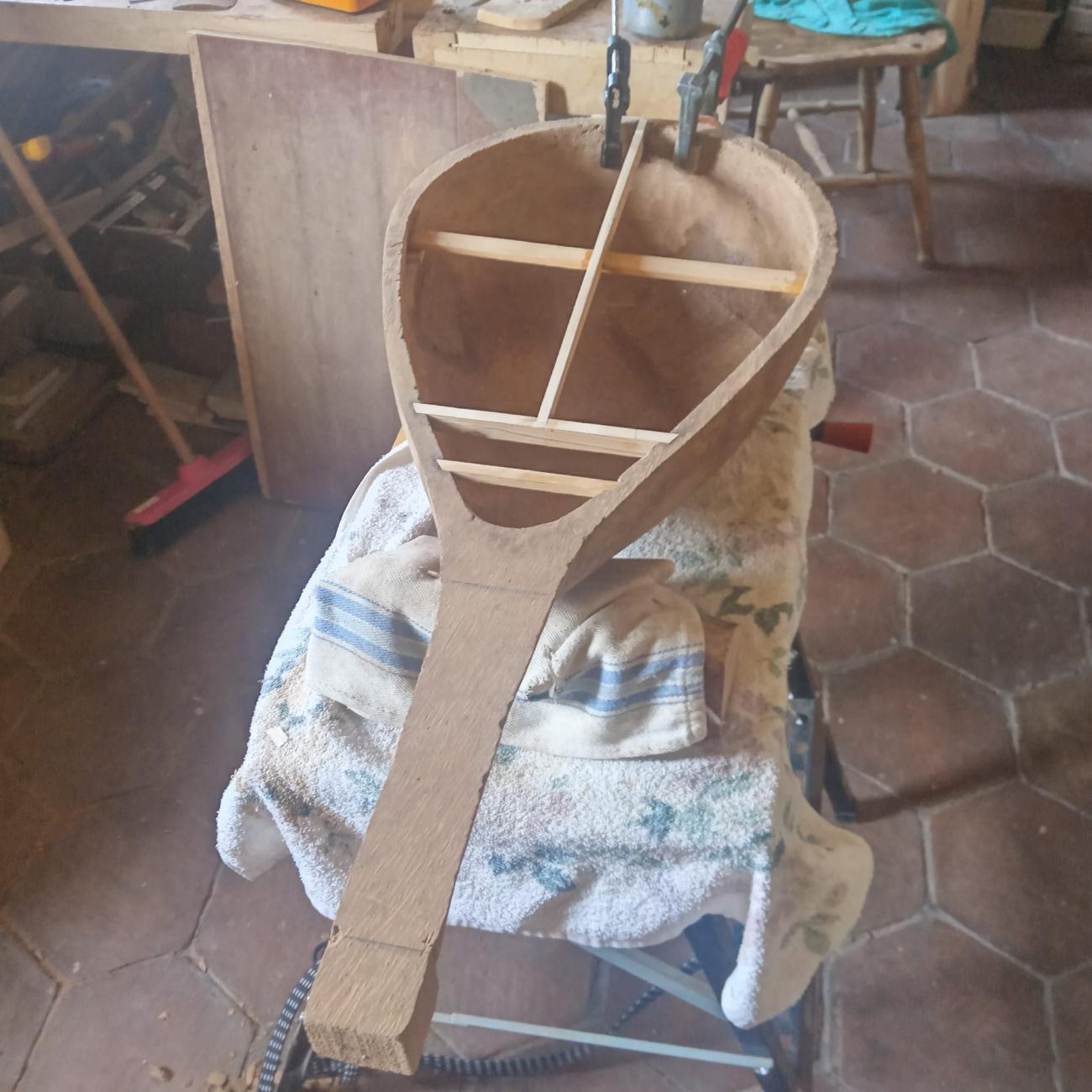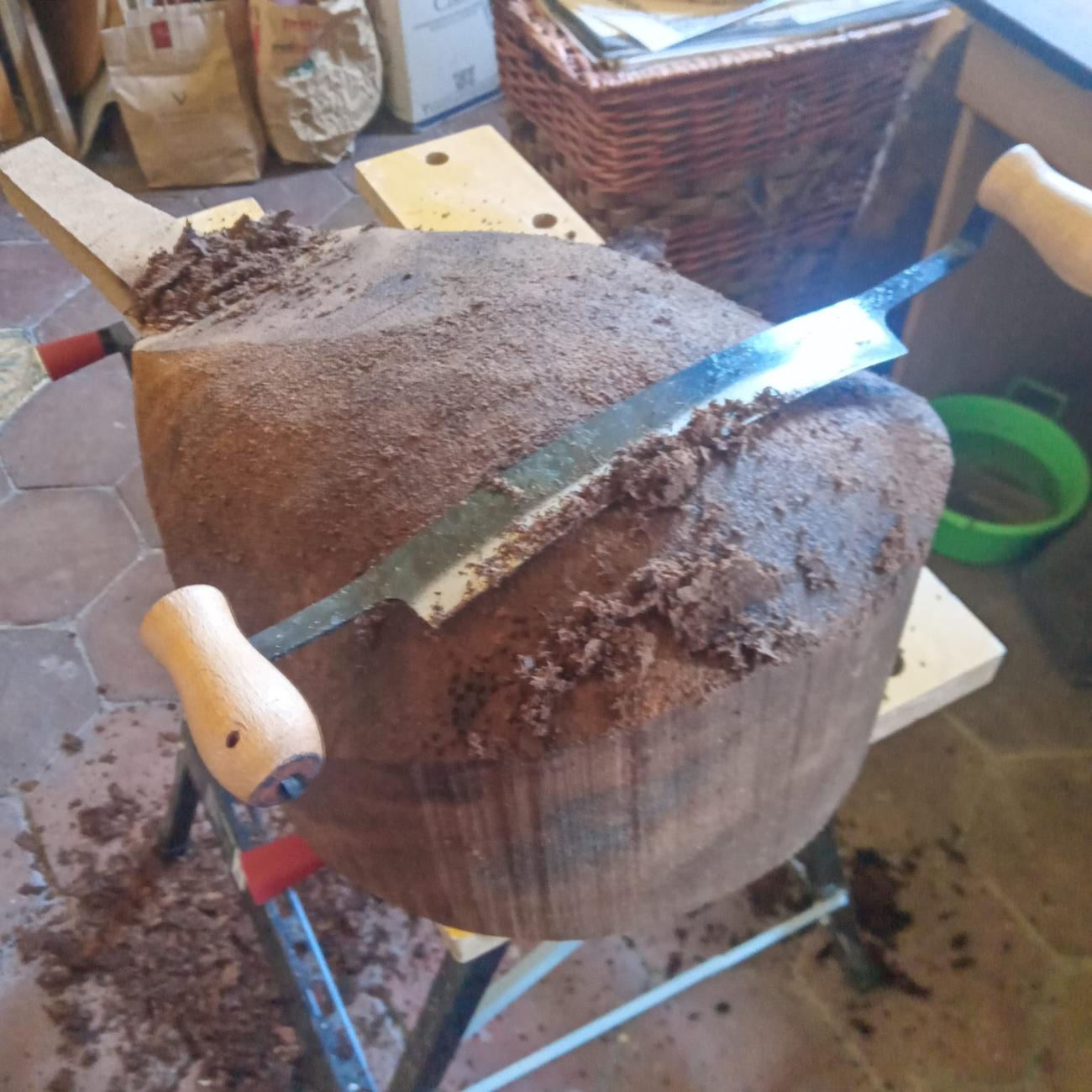 After removing the outer surface, I began to shape the piece using a saw, axe, and a draw knife. Cutting and carving were very easy (See Figure 12). The material in that state was soft and pliable. After roughing out the external shape, I proceeded to hollow out the body, and again, the material was removed surprisingly easily using the axe at first and then common wood gouges, still finding moist fibers even in depth (See Figure 13). In just two days, I achieved a piece that would take at least two weeks to work using any wood, even with the help of electric tools. To control the thickness of the various parts of the body, I made about twenty tiny inspection holes, intending to close them upon completion. When the fibre dehydrates completely, it becomes stiff and strong. I stopped at an average thickness of 5-10 mm. In one of the specimens, I made (arbitrarily, following the model of Turkish saz) an 8 cm diameter hole at the base of the body, into which I glued a rosette, both to lighten that part and to provide more sound exit options. To prevent the body, as robust as it is, from being deformed by the strong tension of the leather that I would apply as the soundboard, I decided to apply an internal wooden cross support (See Figure 14) as I had seen done in loutars , thus ensuring stability both longitudinally and transversely. In small lutes, this internal structure is not necessary.