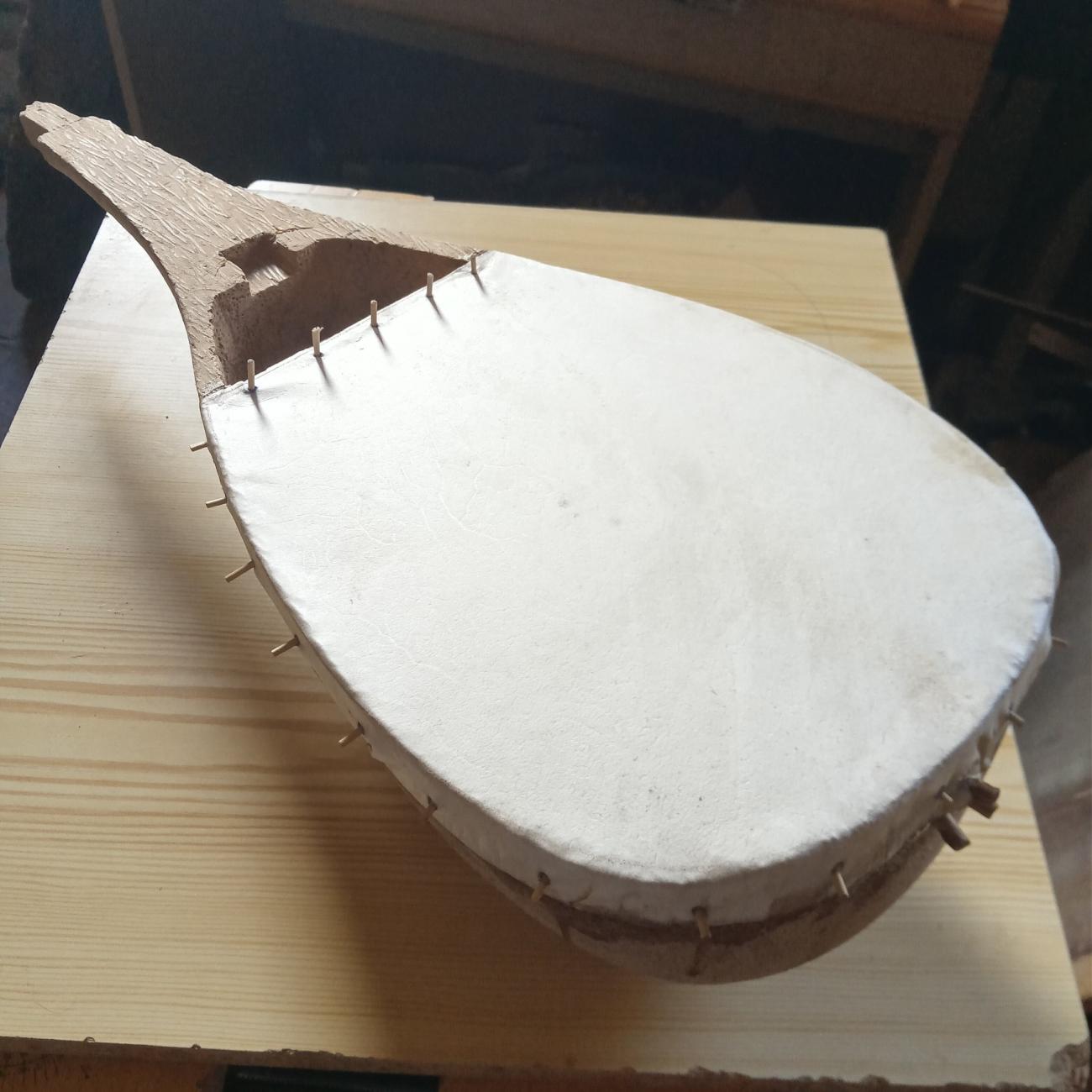 The goat leather soundboard can have a thickness of 0.3 mm or even more, up to 0.9 mm. The processing is the same as for the leather used in the construction of Sicilian drums and tambourines. I bought mine from drum maker Fabrizio Fazio of Gangi (EN) and from traders of Sahel. The leather is soaked for a day, then glued to the edges of the body and the central bar with hide glue and secured with wooden pegs, which are trimmed when the glue and leather are completely dry (See Figure 15). The leather does not touch the transverse reinforcement bar, which remains a couple of centimetres below.