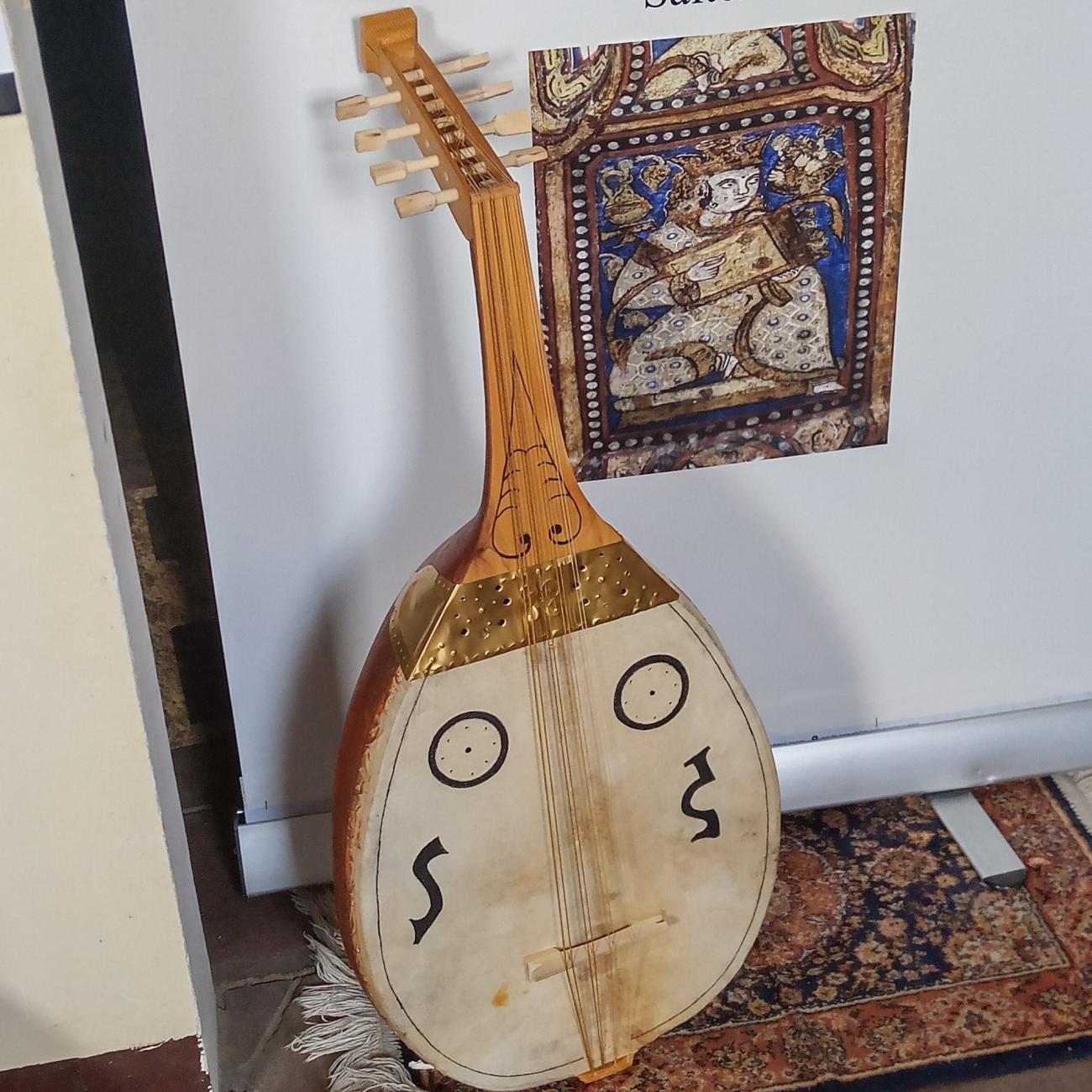 The lutes in the Sicilian paintings come in two sizes: the larger one with four courses of strings (five in some cases) and a straight pegbox, and the smaller one with three courses of strings and a falciform pegbox ending with a zoomorphic head. The instruments always are depicted frontally, so the exact shape of the body is unknown. It is supposed to be rounded and of a depth equal to half the width of the soundboard, according to the indications of Al Kindi (Bouterse,1979). The outer profile of the soundboard blends seamlessly with the neck, without angles.